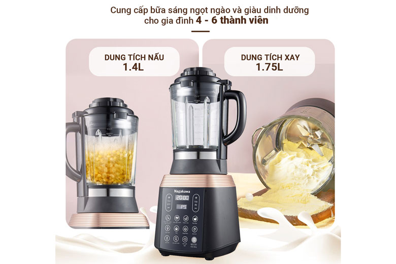 Mua tại TiktokMáy làm sữa hạt Nagakawa NAG0815 Sữa hạt là một loại thực phẩm dinh dưỡng, giúp làm giảm cholesterol và nguy cơ ung thư. không chỉ giúp việc chế biến thức uống này nhanh chóng và dễ dàng mà còn giúp bạn chủ động hơn trong kiểm soát chất lượng nguyên liệu, thành phần; đem lại hiệu quả tốt hơn cho sức khỏe. Thiết kế sang trọng Nagakawa NAG0815 sở hữu thiết kế sang trọng với tông màu chủ đạo là đen cùng vàng đồng hiện đại. Cùng với thiết kế bắt mắt & kích thước nhỏ gọn, bạn có thể đặt máy làm sữa hạt đa năng trên kệ bếp mà không sợ tốn diện tích. Cung cấp bữa sáng cho đại gia đình NAG0815 có dung tích và công suất nấu đáp ứng cho gia đình từ 4 - 6 người.