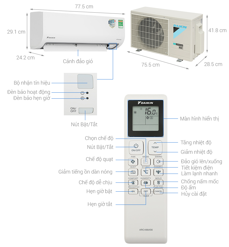 LƯU Ý: ● ĐƠN HÀNG KHÁCH Ở HỒ CHÍ MINH --- SHOP GIAO MIỄN PHÍ (TRỪ CẦN GIỜ). THÔNG TIN SẢN PHẨM: Phạm vi làm lạnh hiệu quả: Dưới 15m² (từ 30 đến 45m³) Công suất sưởi ấm: Không có sưởi ấm Lưu lượng gió lạnh (m³/phút): Cao: 7.8 - Trung bình: 6.7 - Thấp: 5.0 Dòng điện hoạt động: 5A Độ ồn trung bình: 50 dB Dòng sản phẩm: 2025 Sản xuất tại: Thái Lan Chất liệu dàn tản nhiệt: Ống dẫn gas bằng Đồng - Lá tản nhiệt bằng Nhôm Loại Gas: R-32 Tiêu thụ điện: 0.92 kW/h Nhãn năng lượng: 5 sao (Hiệu suất năng lượng 4.28) Công nghệ tiết kiệm điện: Dual inverterEnergy Ctrl - Kiểm soát năng lượng chủ động 4 mức Lọc bụi, kháng khuẩn, khử mùi: Bộ lọc PM 2.5Màng lọc sơ cấp Chế độ gió: Điều khiển lên xuống tự động, trái phải tùy chỉnh tay Công nghệ làm lạnh nhanh: Jet Cool Tiện ích: Chế độ ngủ đêm tránh buốt Chức năng tự chẩn đoán lỗi Công nghệ Gold-Fin chống ăn mòn Hẹn giờ bật, tắt Điều khiển bằng điện thoại, có wifi Thổi gió dễ chịu (cho trẻ em, người già) Tự khởi động lại khi có điện Chức năng tự làm sạch Kích thước - Khối lượng dàn lạnh: Dài 75.6 cm - Cao 26.5 cm - Dày 18.4 cm - Nặng 7.4 kg Kích thước - Khối lượng dàn nóng: Dài 71.7 cm - Cao 49.5 cm - Dày 23 cm - Nặng 22.1 kg Dòng điện vào: Dàn lạnh Kích thước ống đồng: 6.35/9.52