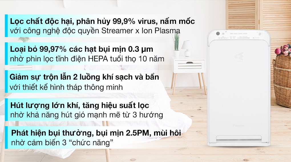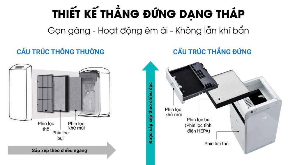 - Làm sạch (Clean): Streamer loại bỏ vi khuẩn bám trên phin lọc bụi và khay nước tạo ẩm. Phin lọc tĩnh điện HEPA lọc bụi hiệu quả hơn nhờ vào lực tĩnh điện, loại bỏ 99.97% các hạt bụi có kích thước 0.3 μm Vượt trội hơn phin HEPA thông thường, phin lọc HEPA của máy lọc khí Daikin được nạp tĩnh điện nên có khả năng lọc không khí tối ưu hơn. Bản thân sợi của phin lọc được nạp tĩnh điện nên có khả năng hút bụi một cách hiệu quả, loại bỏ đến 99.97% các hạt bụi có kích thước nhỏ đến 0.3 µm* với thiết kế hình tháp thông minh, tinh tế nhỏ gọn, màu sắc trang nhã, tăng tính thẩm mỹ cho căn phòng Sản phẩm sở hữu thiết kế dạng tháp, mang lại nhiều ưu điểm vượt trội: