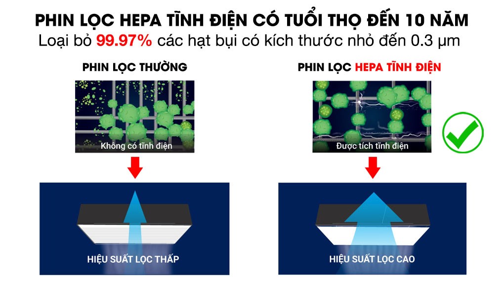 - Giữ bụi và các chất gây ô nhiễm hiệu quả với phin lọc tĩnh điện HEPA.