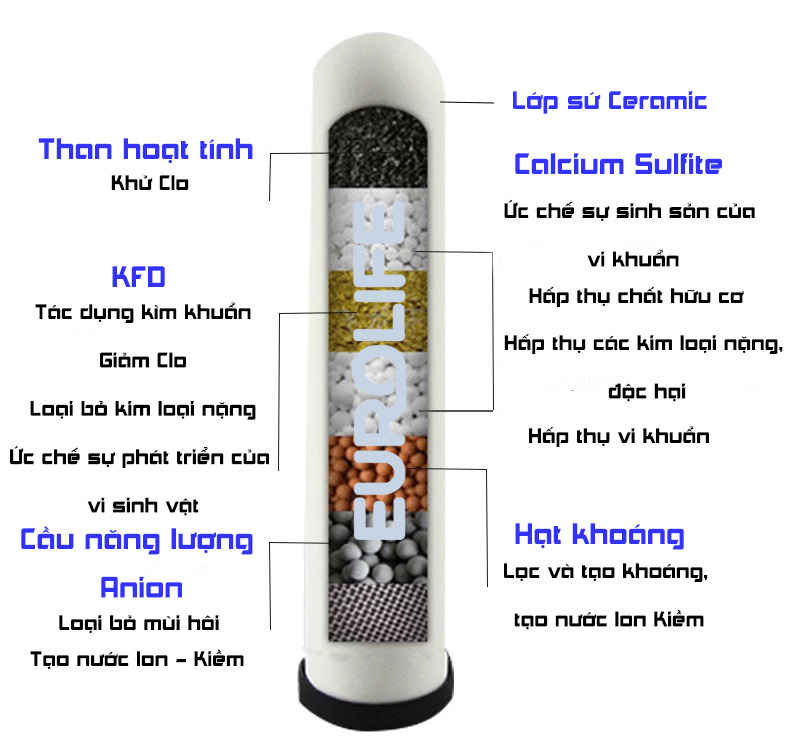 - LÕI SỐ 1 -Ceramic- Lõi Ceramic : Lõi được cấu tạo với lớp vỏ bằng gốm Ceramic cùng các hạt khoáng tạo Ion Kiềm bên trong Chức năng: có khả năng loại bỏ nhiều chất hòa tan trong nước, các kim loại nặng, vi khuẩn, vi sinh vật chống nấm mốc, các hợp chất hữu cơ, thuốc trừ sâu với kích thước < 5 micromet. Lõi Ceramic lọc nước bằng cách sử dụng cấu trúc xốp độc đáo của nó và các tính năng hấp thụ mạnh hiệu quả có thể loại bỏ các hợp chất hữu cơ trong nước, các kim loại nặng và các tạp chất khác, thường là khả năng loại bỏ 63% -86% các chất dạng keo; khoảng 50% sắt và 47% -60% của các chất hữu cơ. Dưới áp lực (áp suất 0.07-0.7Mpa, một 1.05Mpa tối đa), có thể loại bỏ các tạp chất trong nước, vi khuẩn, vi sinh vật, kim loại nặng, vv, và có tác dụng chống vi khuẩn, chống nấm mốc chức năng khử trùng.