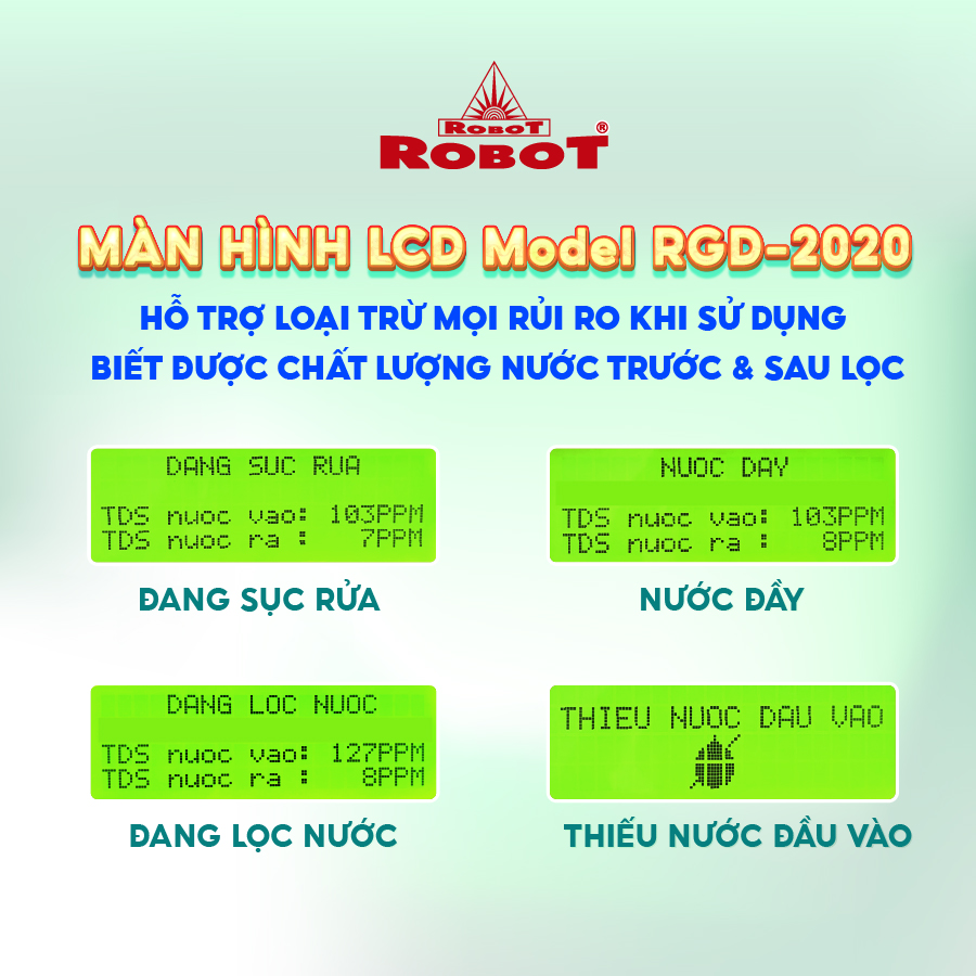 - ROBOT nghiên cứu thiết kế với tiêu chuẩn kỹ thuật, chất lượng chuyên sâu, ứng dụng công nghệ lọc tiên tiến, vật liệu - lõi lọc nhập khẩu từ Hàn Quốc, để đảm bảo máy sử dụng được với nhiều nguồn nước khác nhau khắp thành thị & nông thôn, như nước máy, nước giếng, nhiễm cứng, đá vôi đáp ứng nhu cầu người tiêu dùng trong & ngoài nước.