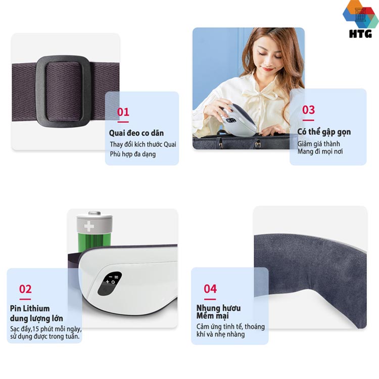 Máy massage mắt HTG MM05 tích hợp điều khiển từ xa, 5 in 1 phiên bản nâng cấp, 2 cấp độ xoa bóp