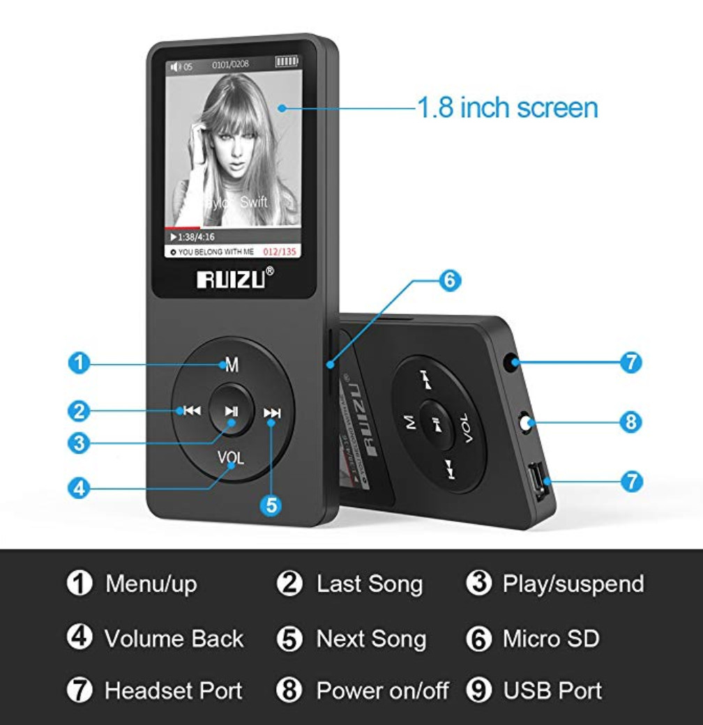 - Máy nghe nhạc RUIZU D19 thiết kế nhỏ gọn, kiểu dáng thể thao, màn hình màu TFT 2,4 inch cảm ứng mang lại hình ảnh sắc nét, kết nối bluetooth 5.0 ổn định trong phạm vi