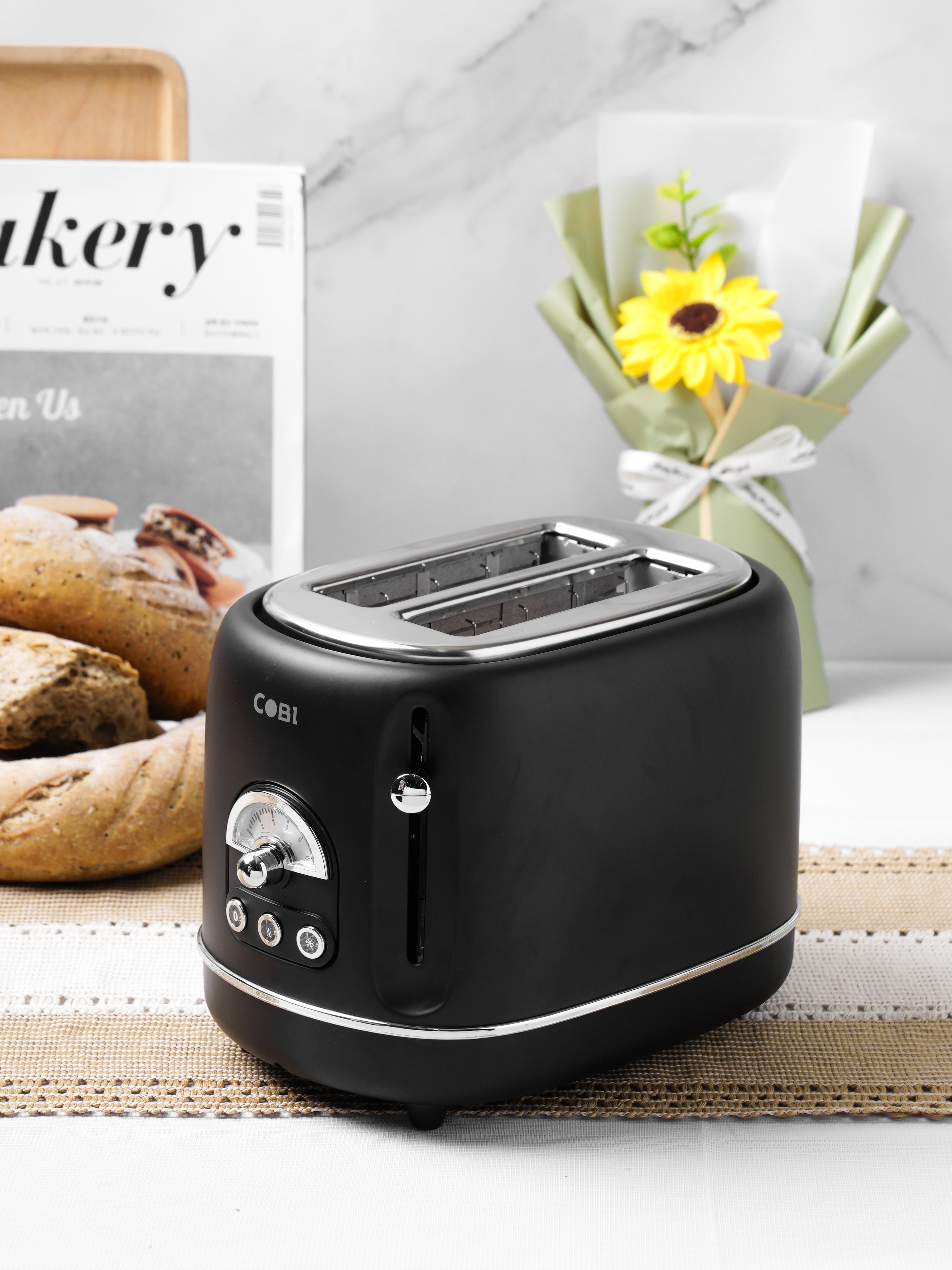 Sáu mức độ nâu có thể điều chỉnh Kẹp bánh mì nướng tích hợp Hai khe nướng bánh mì cực rộng Tự động định tâm bánh mì Đầu gắn bánh mì và ngăn đựng vụn