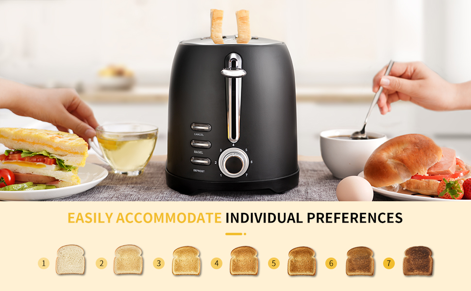 Sáu mức độ nâu có thể điều chỉnh Kẹp bánh mì nướng tích hợp Hai khe nướng bánh mì cực rộng Tự động định tâm bánh mì Đầu gắn bánh mì và ngăn đựng vụn