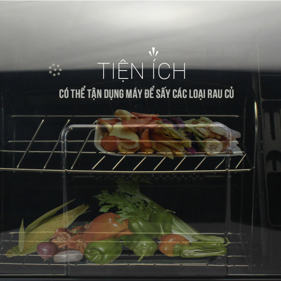 - Đa Chức Năng: Ngoài chức năng sấy khô, máy còn có thể sử dụng để sấy khô rau củ và nhiều đồ dùng khác trong nhà bếp, đồng thời cũng có thể dùng như một kệ để bát đĩa.