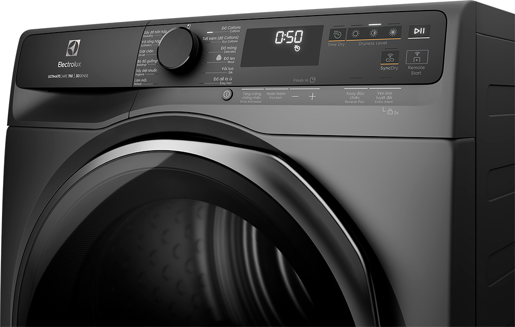 Tiện ích:Đồng bộ SyncDryĐiều khiển qua ứng dụng ElectroluxTùy chọn chương trình (cá nhân hóa) thông minh SmartSelectTùy chỉnh thời gian và mức độ sấySấy hơi nước làm mới quần áo Steam RefreshSấy diệt khuẩn HygieneMàn hình hiển thị ColorTFT sắc nétKết nối từ xa Remote StartHẹn giờ hoàn thànhCông nghệ Woolmark dành để sấy riêng cho đồ lenCông nghệ SteamCare giảm nhăn đến 50% bằng hơi nướcCông nghệ SensiCare chăm sóc quần áo tránh bị hư tổnCông nghệ DelicateCare bảo vệ đồ len không bị biến dạngCông nghệ ColourCareChương trình sấy đồ hỗn hợp thông minh MixedDryChương trình sấy đồ mỏngChương trình sấy nhanhChuông báo lấy quần áo khi kết thúcCảm biến độ ẩm 3DSense để điều chỉnh thời gian sấy phù hợpReverse Tumbling sấy đảo chiều chống nhăn, giúp áo quần không bị xoắn rốiĐèn chiếu sáng lồng sấyTạm dừng thêm quần áoTự khởi động lại khi có điện