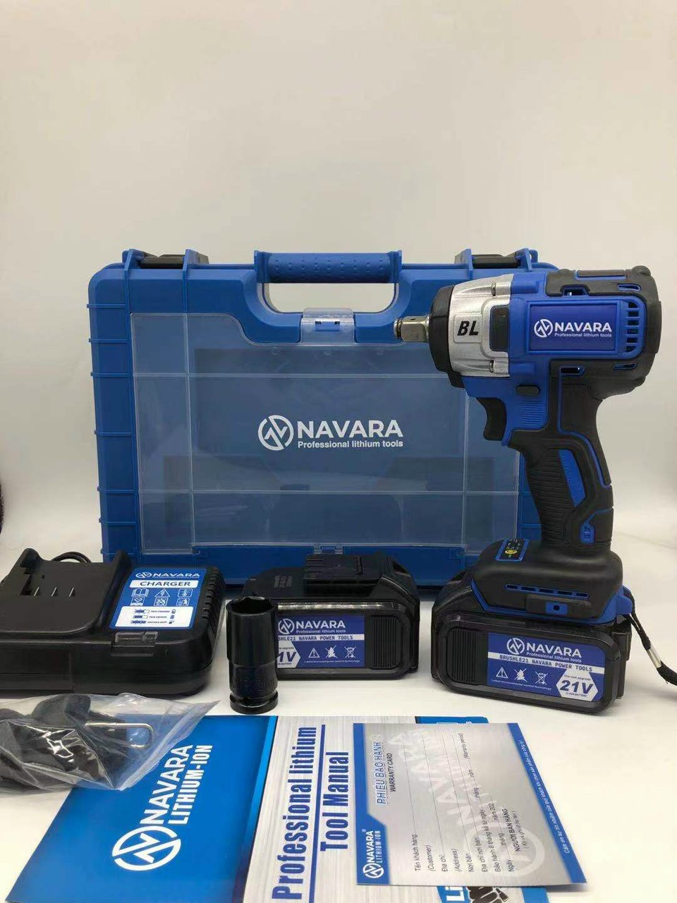 Phụ kiện bao gồm: 01 hộp máy, 01 thân máy, 02 pin, 01 sạc bàn pin tự ngắt khi đầy, 01 khẩu Φ22mm, 01 dây đeo