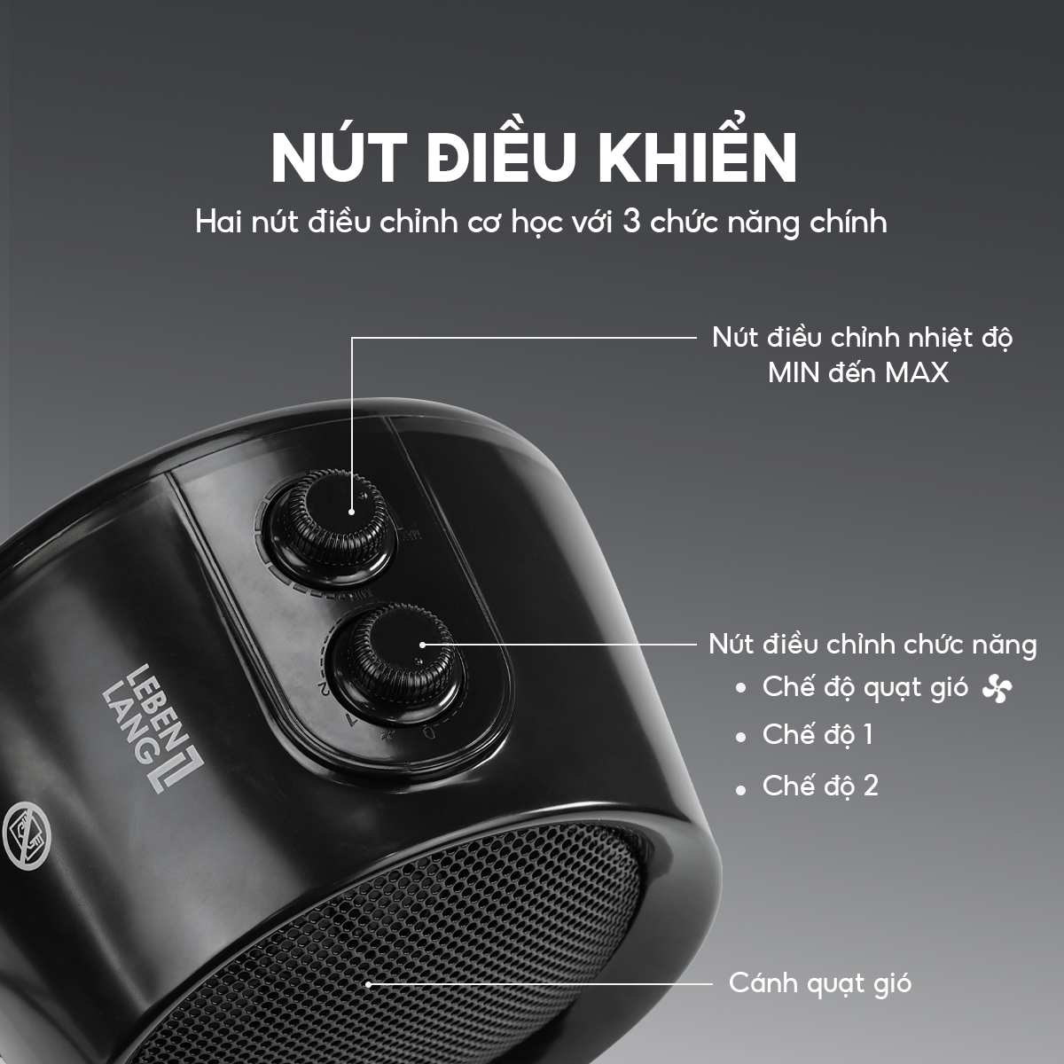 Máy sưởi mini dáng tròn Lebenlang LBL0275, công suất 1500W, làm ấm góc rộng, nóng nhanh, nhỏ gọn tiện lợi - hàng chính hãng 8 LÝ DO BẠN NÊN CHỌN MÁY SƯỞI CỦA LEBENLANG - Công suất mạnh mẽ 1500W - Làm ấm góc rộng - Nóng nhanh tiết kiệm thời gian, năng lượng - Không gây khó thở và khô da - Nhỏ gọn và tiện lợi, thiết kế bắt mắt - Độ bền cao - Hàng chính hãng, bảo hành 2 năm I. THÔNG SỐ KỸ THUẬT - Thương hiệu: Lebenlang - Model: LBL0275 - Màu sắc: Đenn - Công suất: 1500W - Cân nặng: 1,36kg - Dây nguồn: 1m4 - Kích thước: 23 x 18 x 23 cm - Chất liệu: nhựa ABS cao cấp II. ĐẶC ĐIỂM NỔI BẬT Cảm giác ấm áp và tiện lợi không còn xa xôi với Máy Sưởi Mini Lebenlang LBL0275. Thiết kế nhỏ gọn dáng tròn với kích thước chỉ 23x18x23cm, sản phẩm này dễ dàng đặt trên bàn làm việc, bàn học, phòng ngủ hoặc bất kỳ không gian nào dưới 15m². ️ Với công suất tối đa 1500W, máy sưởi này có thể nhanh chóng làm ấm không gian xung quanh bạn. Máy sưởi Lebenlang hoạt động cực kỳ hiệu quả, tỏa nhiệt góc rộng lên đến 70 độ, đảm bảo không gian ấm áp đều đặn. ️ Máy sưởi Lebenlang LBL0275 có 2 nút điều chỉnh cơ học với 3 chức năng chính. Bạn có thể điều chỉnh nhiệt độ từ MIN đến MAX theo mong muốn và chọn chế độ hoạt động phù hợp: chế độ quạt gió, chế độ 1 hoặc chế độ 2. Đặc biệt, máy sưởi LBL0275 có chế độ tiết kiệm năng lượng với công suất 750W, giúp bạn tiết kiệm đến 50% năng lượng điện. ️ Quạt sưởi mini với tiếng ồn thấp, máy không gây ảnh hưởng đến giấc ngủ hoặc các hoạt động khác.