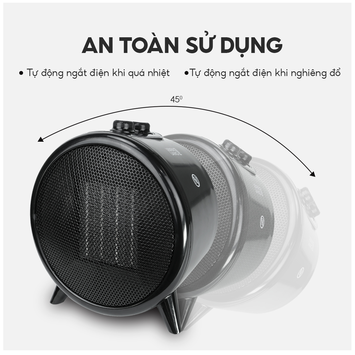 Thiết kế nhỏ gọn, tiện dụng Sưởi ấm nhanh, không gây tiếng ồn 3 mức phát nhiệt Có tính năng quay đảo hướng phát nhiệt, phạm vi phát nhiệt rộng Lưới tản nhiệt thiết kế