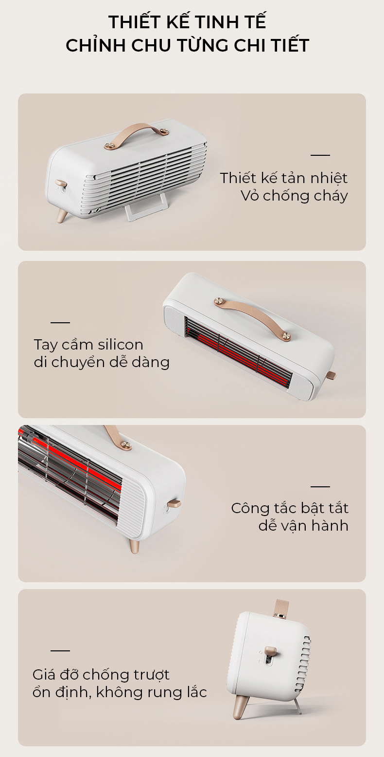 Thiết kế nhỏ gọn, tiện dụng Sưởi ấm nhanh, không gây tiếng ồn 3 mức phát nhiệt Có tính năng quay đảo hướng phát nhiệt, phạm vi phát nhiệt rộng Lưới tản nhiệt thiết kế