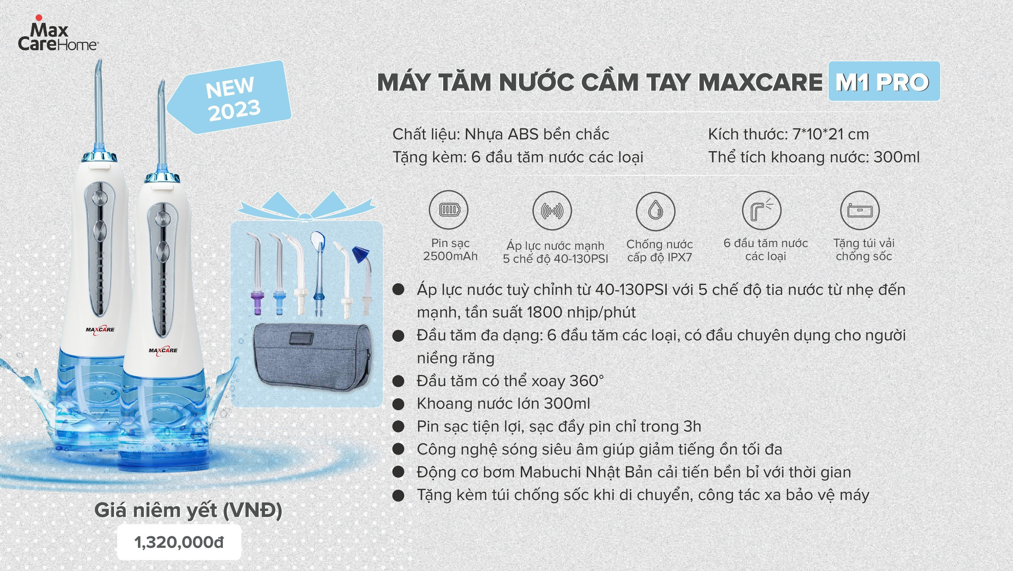Xuất xứ thương hiệu Việt Nam Thông tin sản phẩm Maxcare M1Pro đi kèm 6 đầu tăm, 5 chế độ chỉnh áp lực, đầu phun có khả năng xoay 360 độ, dung tích bình nước 300ml, đạt chuẩn chống nước IPX7. Đặc điểm nổi bật của máy tăm nước cầm tay Maxcare M1Pro Xịt sạch kẽ răng rất nhanh Máy tăm nước Maxcare M1Pro có đường kính đầu tăm siêu nhỏ chỉ 0.6mm tạo ra các tia nước mạnh và mảnh, đầu phun có khả năng xoay 360 độ sẽ làm sạch mọi ngóc ngách và lấy đi 99.99% mảng vụn bám thức ăn giúp làm sạch răng dịu nhẹ, không gây ê buốt, không chảy máu lợi, không thưa răng. Máy tăm nước có xung tần số lên tới 1.600 nhịp/phút, tạo ra hàng triệu bọt khí li ti, làm sạch 99.99% thức ăn thừa, quét sạch mảng bám cả những vùng khó chạm tới nhất mà không gây chảy máu nướu, không thưa răng. 5 chế độ phù hợp với mọi đối tượng Máy tăm nước có 5 chế độ áp lực tia nước từ nhẹ tới mạnh, để phù hợp với nhiều người dùng khác nhau, kể cả người răng nướu nhạy cảm, niềng răng, bọc sứ, implant.