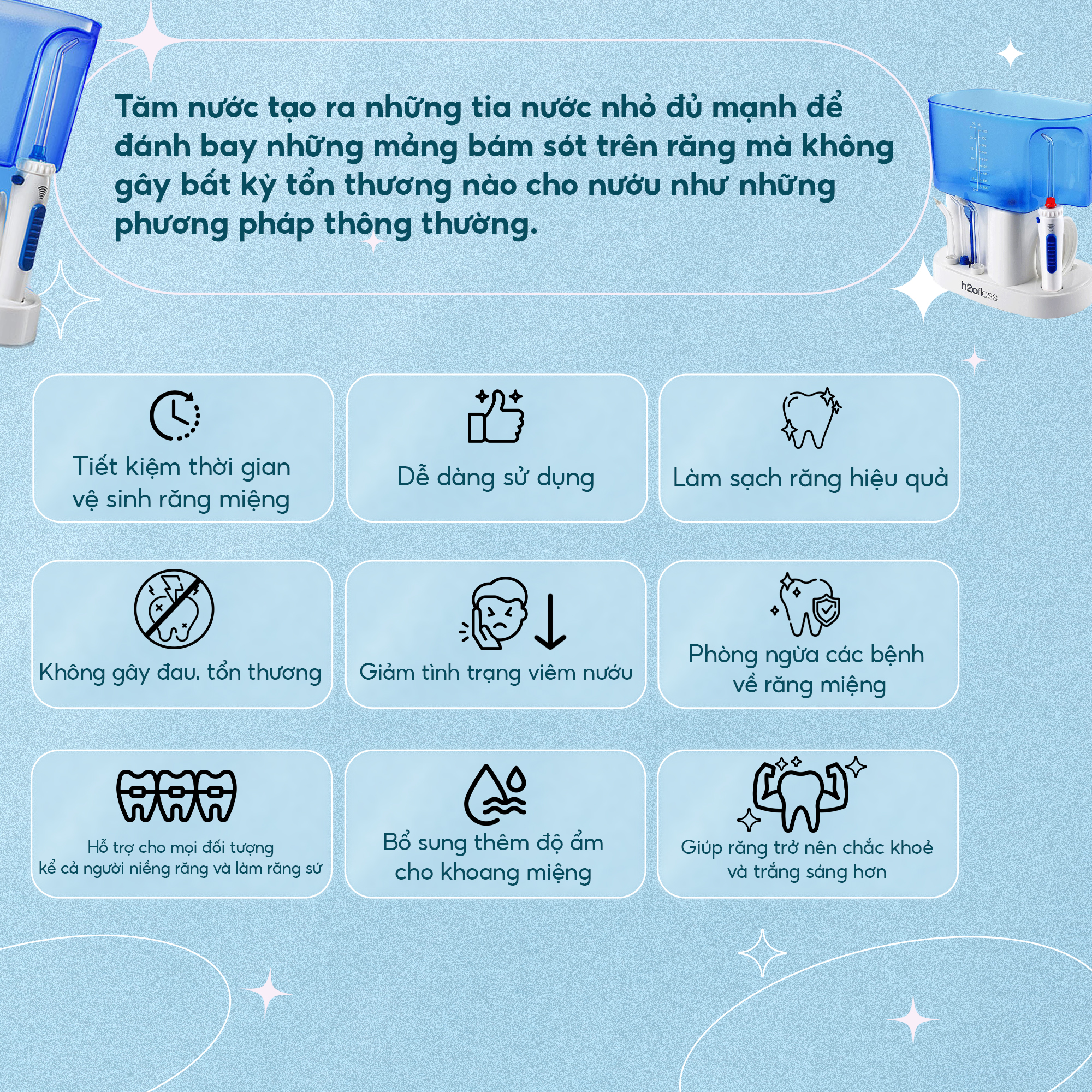 - Nước phun 1200 lần 1 phút với tia nước siêu âm, dễ dàng làm sạch mảng bám ở các kẽ răng