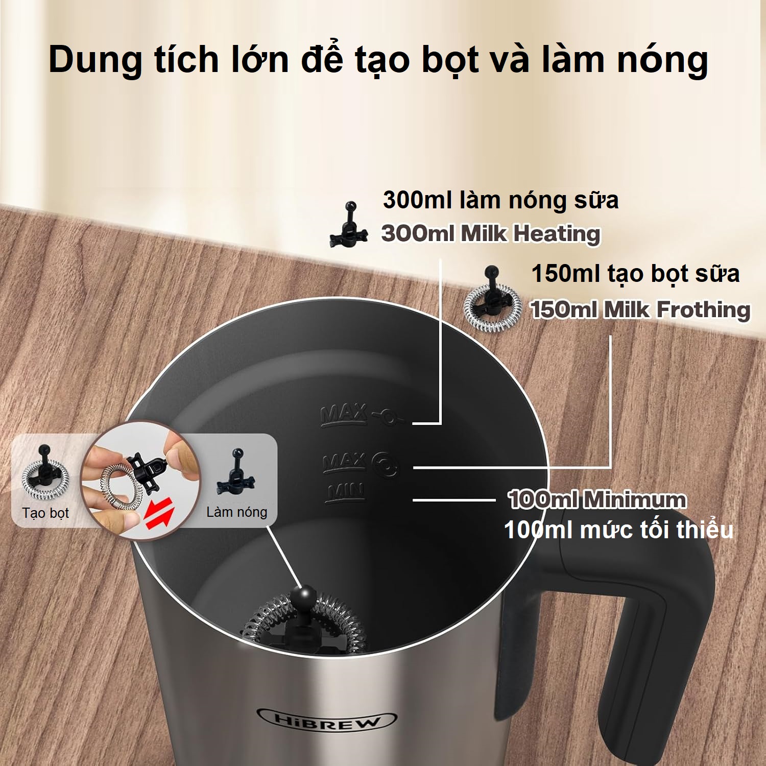 - HiBREW M3A có dung tích lý tưởng cho người sử dụng: Dung tích đánh bọt sữa lên đến 150 ml và làm nóng sữa lên đến 300 ml. Với dung tích này, chỉ cần một lần đánh bọt sữa là bạn đã có thể chế biến ra nhiều đồ uống có bọt hoàn hảo với lớp bọt sữa quyến rũ phía trên bề mặt.