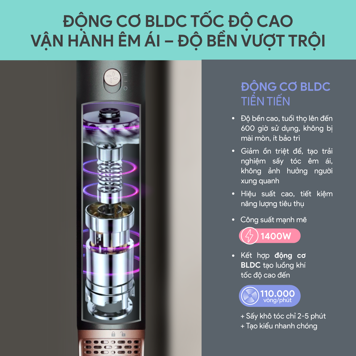 - Luồng khí tốc độ cao lên đến 110,000 vòng/ phút, sấy khô chỉ 2-5 phút và tạo kiểu nhanh chóng từ trong ra ngoài