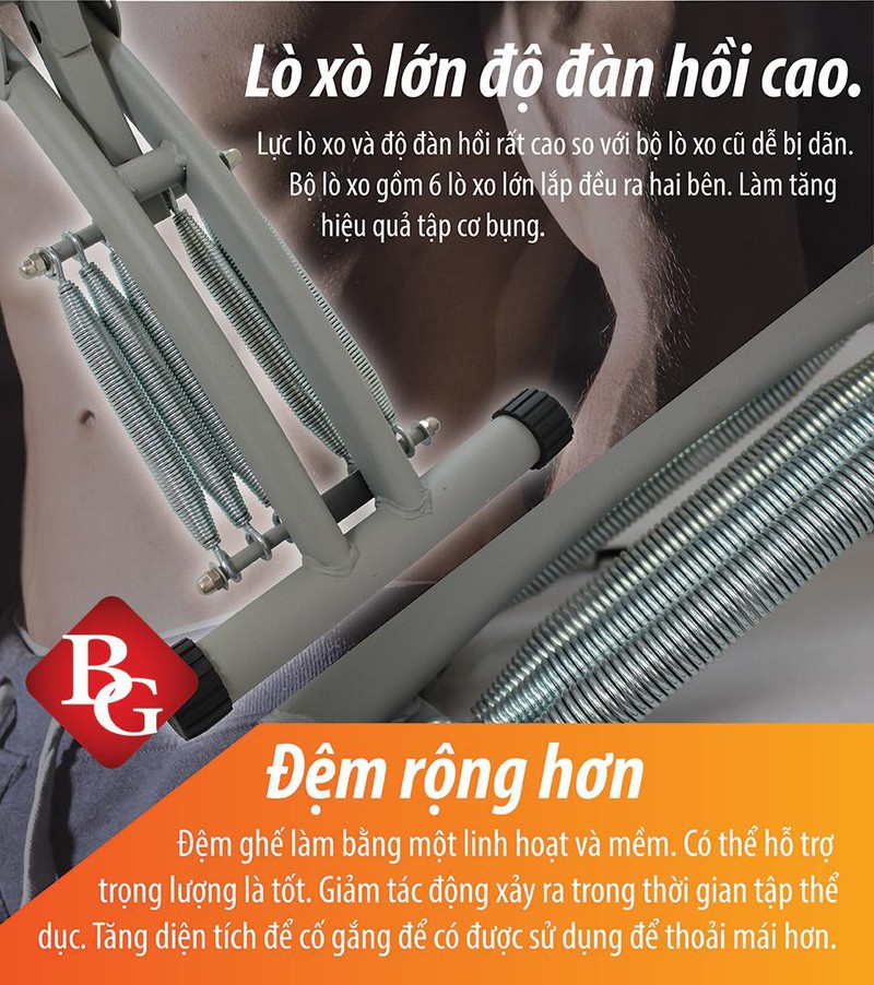 Máy Tập Cơ Bụng Đa Năng Cải Tiến Six Pack Care BG KM2107 giúp bạn giảm lượng mỡ dư thừa ở vòng 2 chỉ cần bạn tập động tác gập ngã người thì nhóm cơ bụng trên, bụng giữa, bụng dưới và cơ chéo hai bên hông được căng giãn một cách tối đa nhờ có sử dụng 2 cặp lò xo kéo làm tăng hiệu quả tập. Ngoài ra, máy được thiết kế dây kéo tay và thanh đỡ tập cơ bắp chân, độ rộng ghế ngồi thoải mái, vừa tạo nét thẩm mỹ vừa có khả năng chịu lực giúp bạn có thể dễ dàng thực hiện động tác hít đất, tập riêng cho cơ cánh tay.