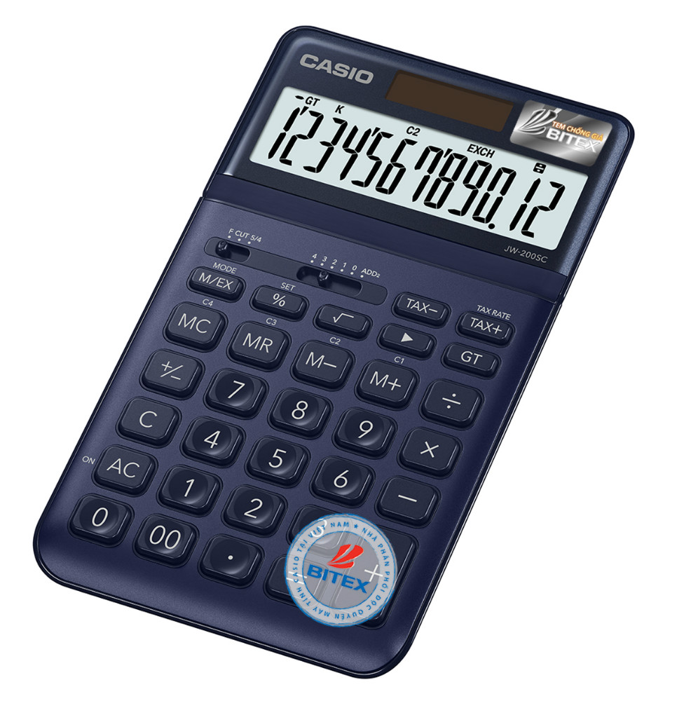 Máy Tính Để Bàn Casio JW200SC sử dụng chế độ sử dụng năng lượng mặt trời được bật khi đủ sáng, chế độ pin được bật khi không đủ sáng.
