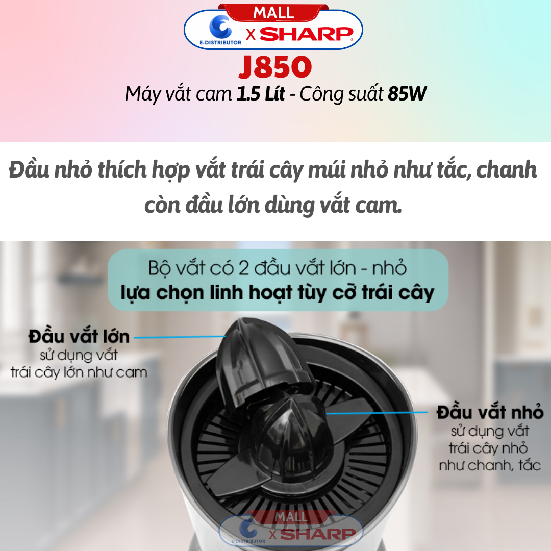 THÔNG TIN SẢN PHẨM Thông số kỹ thuật Máy vắt cam Sharp Công suất: 85W / EJ-J850-BK - Chức năng: Vắt quýt, Vắt chanh, Vắt cam - Công suất: 85W  - Dung tích: Đầu rót trực tiếp - Tốc độ: 1 tốc độ - Chất liệu lưới lọc: Nhựa ABS, Nhựa - Chất liệu ca chứa, thân máy: Thân máy Nhựa - Chất liệu đầu vắt: Nhựa ABS - Tiện ích: Vòi chống nhỏ giọtCó nắp đậy2 đầu vắt lớn và nhỏ - Chế độ an toàn: Chân đế chống trượt - Chiều dài dây điện: 105 cm - Thương hiệu: Nhật Bản - Hãng Sharp.  *Chế độ bảo hành: ● Bảo hành 12 tháng kể từ ngày nhận hàng ● Đem giấy bảo hành kèm sản phẩm lại trung tâm bảo hành của Sharp gần nơi anh chị ở nhất để được bảo hành hoặc đem sản phẩm lại kho hàng của shop để bảo hành đều được khi trong quá trình sử dụng sản phẩm bị lỗi kĩ thuật ạ ● Bảo hành chính hãng -   Máy vắt cam Sharp EJ-J850-BK kết cấu chắc chắn, gọn gàng, dễ sử dụng và cất giữ Sản phẩm thiết kế để ép lấy nước những trái cây có múi như cam, quýt, chanh, bưởi. Các bộ phận của máy vắt cam được ghép nối đơn giản giúp bạn dễ dàng tháo lắp để vệ sinh. Máy ra nước ép trực tiếp từ vòi, bạn có thể đặt ly dưới vòi để hứng nước ép dùng ngay