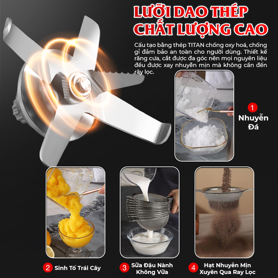 Lưỡi dao chuyên dụng bằng thép titan với đặc tính chống oxy hóa và chống gỉ, đảm bảo không bị ăn mòn theo thời gian và duy trì độ bén của lưỡi dao. Với thiết kế răng cưa đa góc giúp cắt và xay một cách hiệu quả hơn, từ các loại hạt ngũ cốc, trái cây đông lạnh, thực phẩm sống, đá viên hay thậm chí xương sụn đều được xay nhuyễn và mịn.