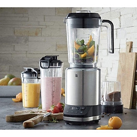 - 2 bình đựng sinh tố với dung tích 0,5l và 0,7l +1 hộp đựng thực phẩm có nắp dung tích 0,3l. ĐẶC ĐIỂM NỔI BẬT: -Máy xay sinh tố đa năng WMF Pro với công suất cực mạnh lên tới 1200W và tốc độ lên tới 30.000 vòng/ phút giúp bạn nhanh chóng thực hiện các công việc xay, nghiền, băm, trộn một cách nhanh chóng và dễ dàng. -Nhìn tổng thể có thể thấy thiết kế máy xay đa năng WMF Pro rất hoàn hỏa trong kích thước, thon gọn, không quá to và cồng kềnh. – Lưỡi dao có 6 cánh được làm từ chất liệu thép không gỉ Cromargan cực kì sắc bạn hoàn toàn có thể làm rất nhiều thứ với chiếc máy xay đa năng này: xay sinh tố, đá bào, xay thịt, cá, tôm, cua, nghiền các loại hạt cứng như cà phê, lạc… – Mặc dù có một công suất cực mạnh nhưng động cơ của máy xay đa năng WMF Pro chạy cực kì êm. – Điều đặc biệt hơn nữa là bạn có những phụ kiện đa dạng đi kèm: 2 bình đựng sinh tố với dung tích 0,5l và 0,7l cùng với 1 hộp đựng thực phẩm có nắp dung tích 0,3l. Những phụ kiện này phục vụ mục đích “to go”. – Máy có 6 tốc độ quay và 3 chương trình có sẵn: smothies, đá bào và nghiền cà phê.
