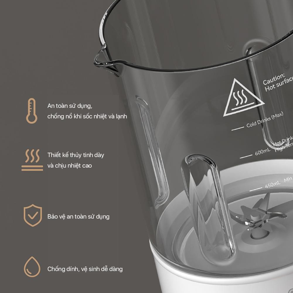 Điện áp : 220-240V/50Hz Năng lượng : A+ Công suất : 500W Lưỡi dao : 10 INOX 304 Dung tích: 800ml Điền khiển : cảm ứng tiếng việt Phụ kiện : Cốc đo, cốc hâm,