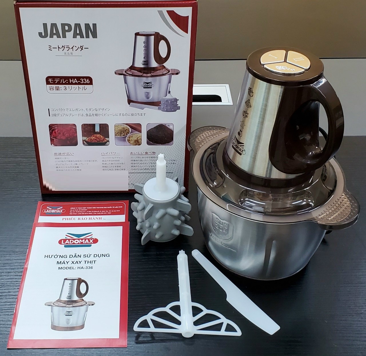 Thông tin sản phẩm - Tên sản phẩm: MÁY XAY THỊT ĐA NĂNG - Thương hiệu: LADOMAX - Model: HA-333 - Điện áp: 220V - 50Hz - Dung tích: 2L - Công suất: 400W -