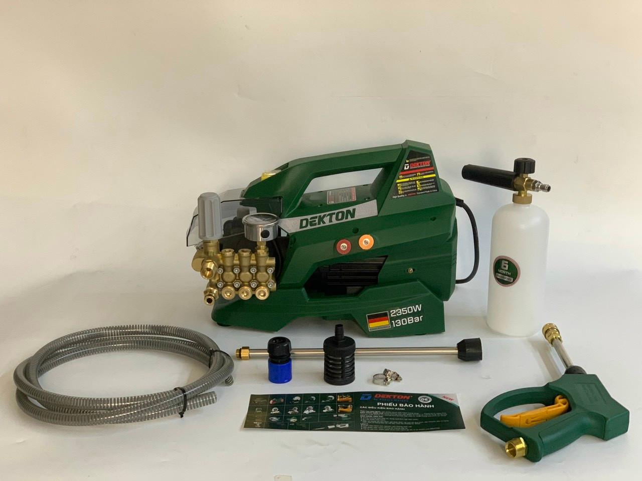 Thông số kỹ thuật -Thương hiệu DEKTON -Xuất xứ Trung Quốc -Model: DK-HPW2350A -Điện áp 220-240V -Công suất 2350W -Tốc độ không tải 2800 rpm -Áp lực tối đa 30-130 bar -Lưu lượng nước 14L/p