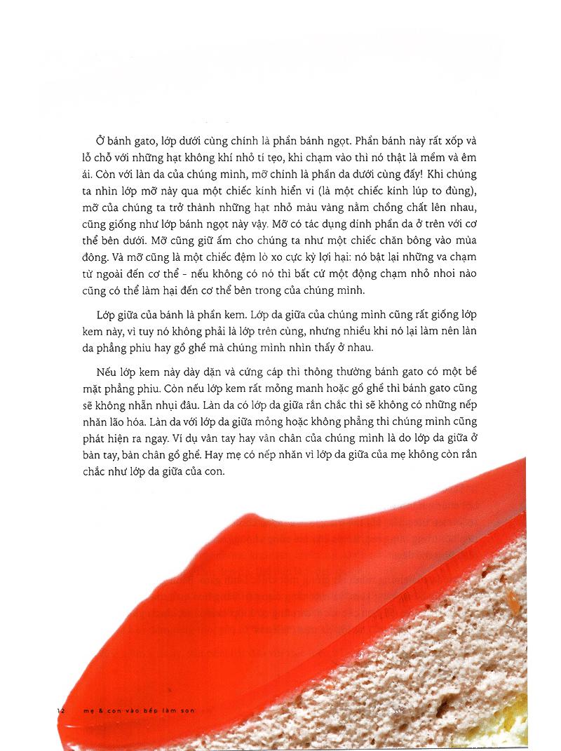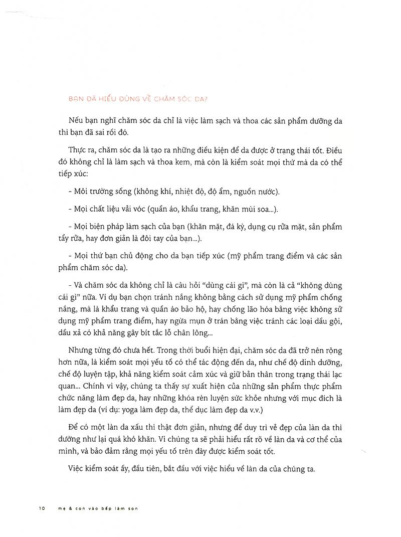 Mẹ và con vào bếp làm son giống như một món quà nhỏ xinh, giàu nữ tính mà người mẹ dành tặng cô con gái bé bỏng, hiếu kỳ. Cuốn sách không chỉ giới thiệu công thức làm son mà còn một số bí quyết làm mỹ phẩm home-made an toàn, lành tính như gel nha đam, dầu dưỡng da hay các sản phẩm thú vị khác như dầu đuổi muỗi, bomb tắm...