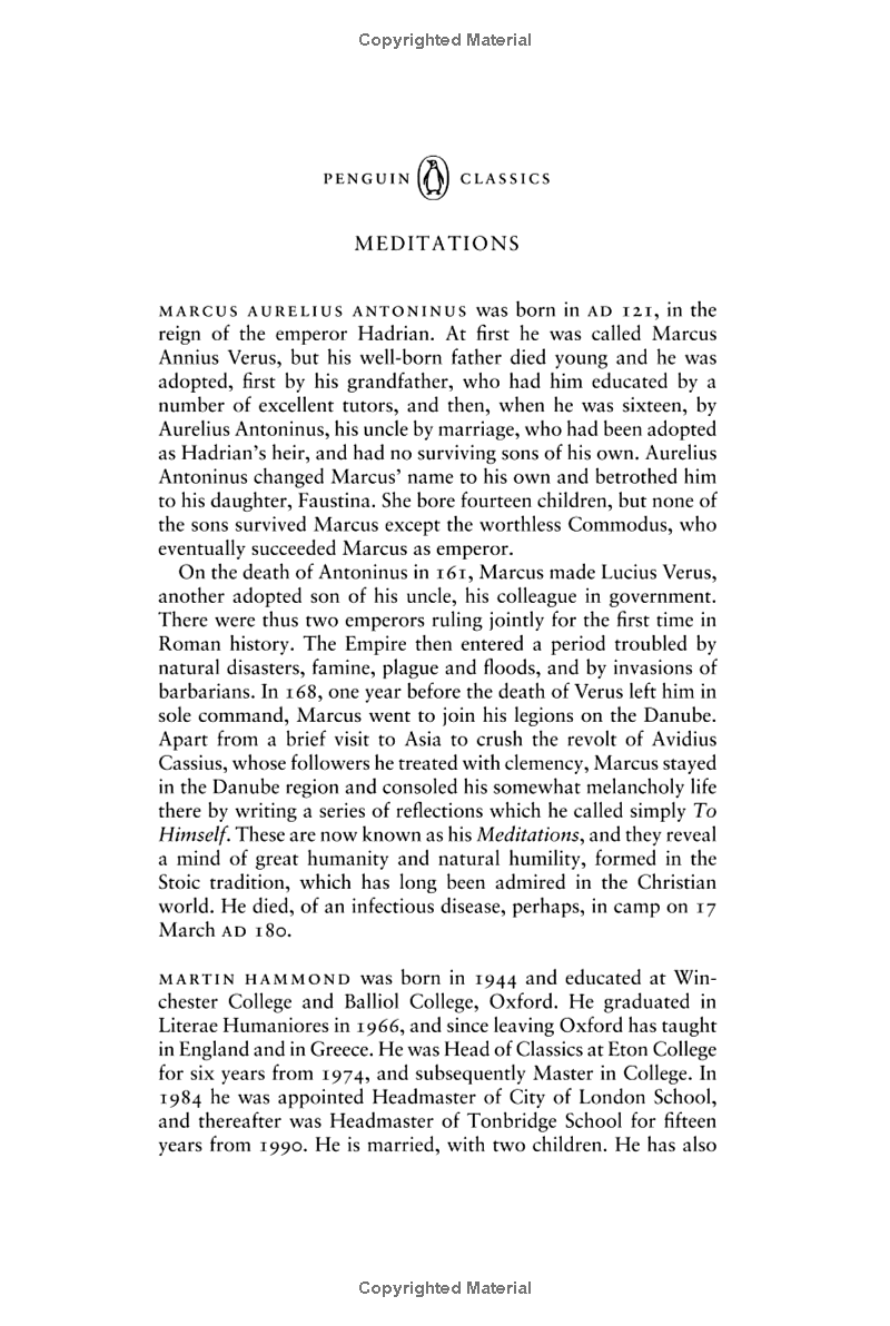 Originally written only for his personal consumption, Marcus Aurelius's Meditations has become a key text in the understanding of Roman Stoic philosophy. This Penguin Classics edition is translated with notes by Martin Hammond and an introduction by