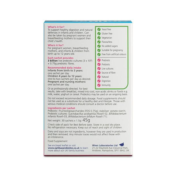 OptiBac Probiotics 'Vì sức khỏe của con bạn' (Màu hồng) được thiết kế chuyên biệt dành cho trẻ em. Được đề xuất dùng hàng ngày, mỗi gói cung cấp 0,75 g chất xơ FOS (fructooligosacarit)