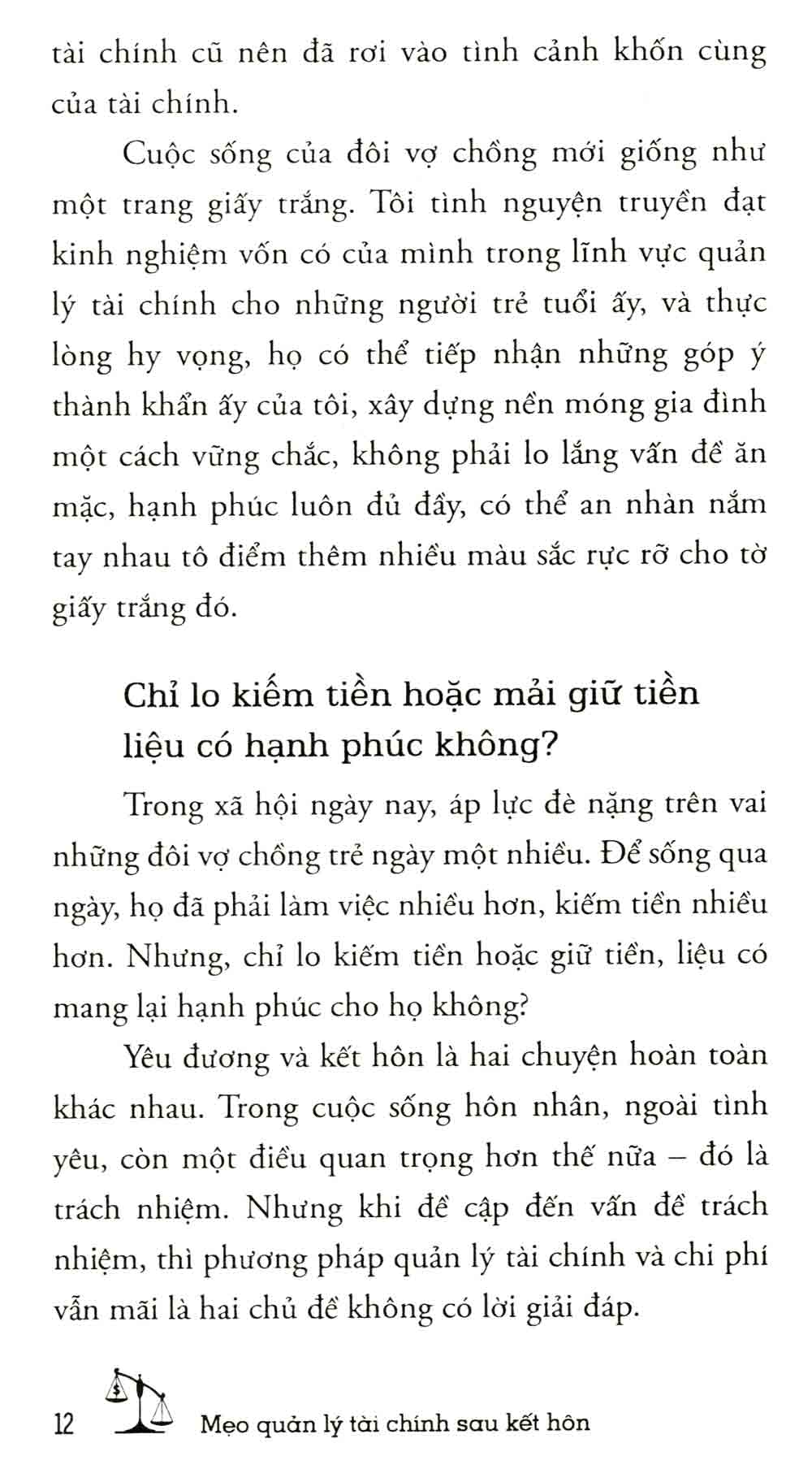 Cuốn sách không chỉ đơn thuần là hướng dẫn lập kế hoạch tài chính, mà còn cung cấp những chiến lược để quản lý tài sản chung sau khi kết hôn và xây dựng một tương lai tài chính vững chắc. Từ cách tích luỹ tiền bạc cho những mục đích dài hạn như mua nhà, nuôi dưỡng con cái đến việc thích nghi với các thay đổi kinh tế, sách cung cấp cho độc giả những công cụ cần thiết để đối mặt với những thách thức tài chính trong cuộc sống hằng ngày.