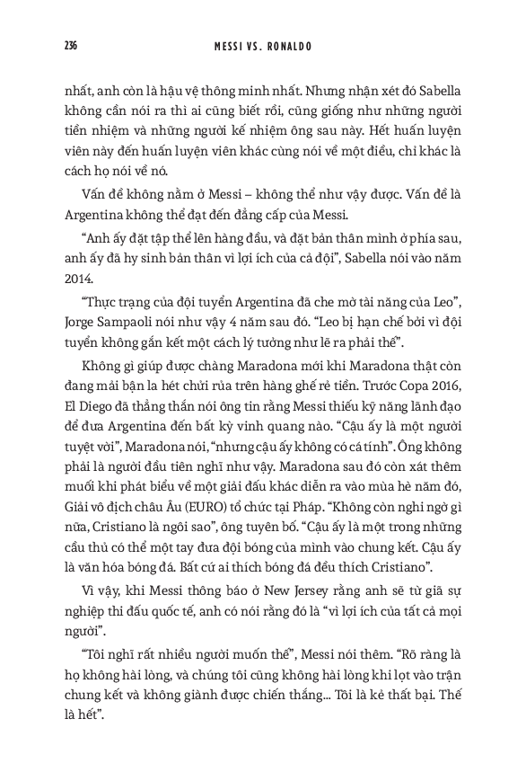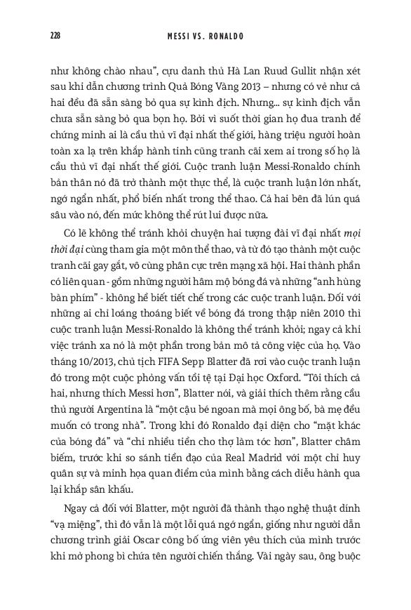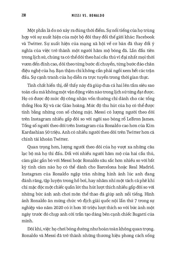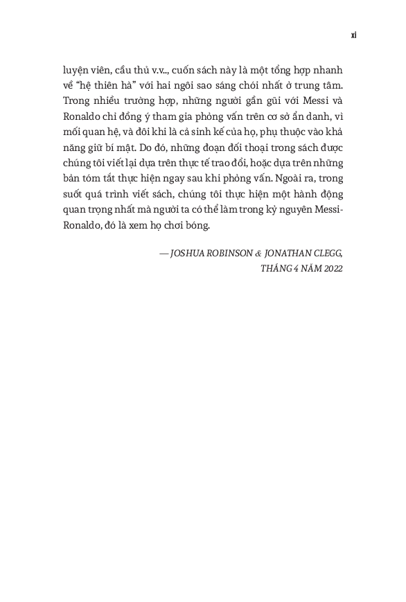 Joshua Robinson và Jonathan Clegg kết hợp những câu chuyện về Messi và Ronaldo thành một sử thi về kỷ nguyên hiện đại của bóng đá, trình bày chi tiết cách thức mà cuộc đua tranh giữa họ đã làm biến đổi cả bóng đá và ngành kinh doanh bóng đá quốc tế, một lần và mãi mãi. Dựa trên những tài liệu gốc và nhiều năm đưa tin trên các tờ báo, cuốn sách này tổng hợp vô số dữ kiện và câu chuyện liên quan tới hai danh thủ. Các tác giả như thể đi sâu vào phòng thay đồ và phòng họp ban lãnh đạo của các câu lạc bộ - những nơi hình thành nên các huyền thoại bóng đá thế giới, và tiết lộ cho độc giả những tình tiết hấp dẫn cả trong và ngoài sân cỏ. Từ những khởi đầu khác nhau tới những bước đi cũng vô cùng khác biệt trong sự nghiệp, hai siêu sao Argentina và Bồ Đào Nha có những cách thành công rất riêng, cùng với những chi tiết đôi khi thực sự thái quá liên quan đến mỗi người. Kết hợp cùng nhau, câu chuyện về họ chính là biểu tượng cho sự tăng trưởng chóng mặt của bóng đá thế giới. Ngoài ra, nó cũng cho thấy cái cách mà truyền thông mạng xã hội đã biến đổi triệt để quyền lực của những ngôi sao thể thao. Cuối cùng, mong muốn khai thác triệt để khoản đầu tư hàng tỷ đô la vào Messi và Ronaldo đã làm thay đổi vài câu lạc bộ hàng đầu châu Âu như Barcelona, Real Madrid và Manchester United. World Cup 2022 có lẽ là giải vô địch thế giới cuối cùng với cả Messi và Ronaldo. Do đó, cuốn sách này cũng dành nhiều trang đánh giá về di sản của họ cho bóng đá, cũng như phân tích những ảnh hưởng mà tài năng của họ tạo ra, cả tích cực lẫn tiêu cực. Hơn cả việc đơn thuần liệt kê những thành tích của hai siêu sao, đây thực sự là một “tiểu sử của cuộc đua tranh” vốn đã trở thành một lăng kính quan trọng để hiểu về quá khứ, hiện tại và tương lai của bóng đá thế giới.