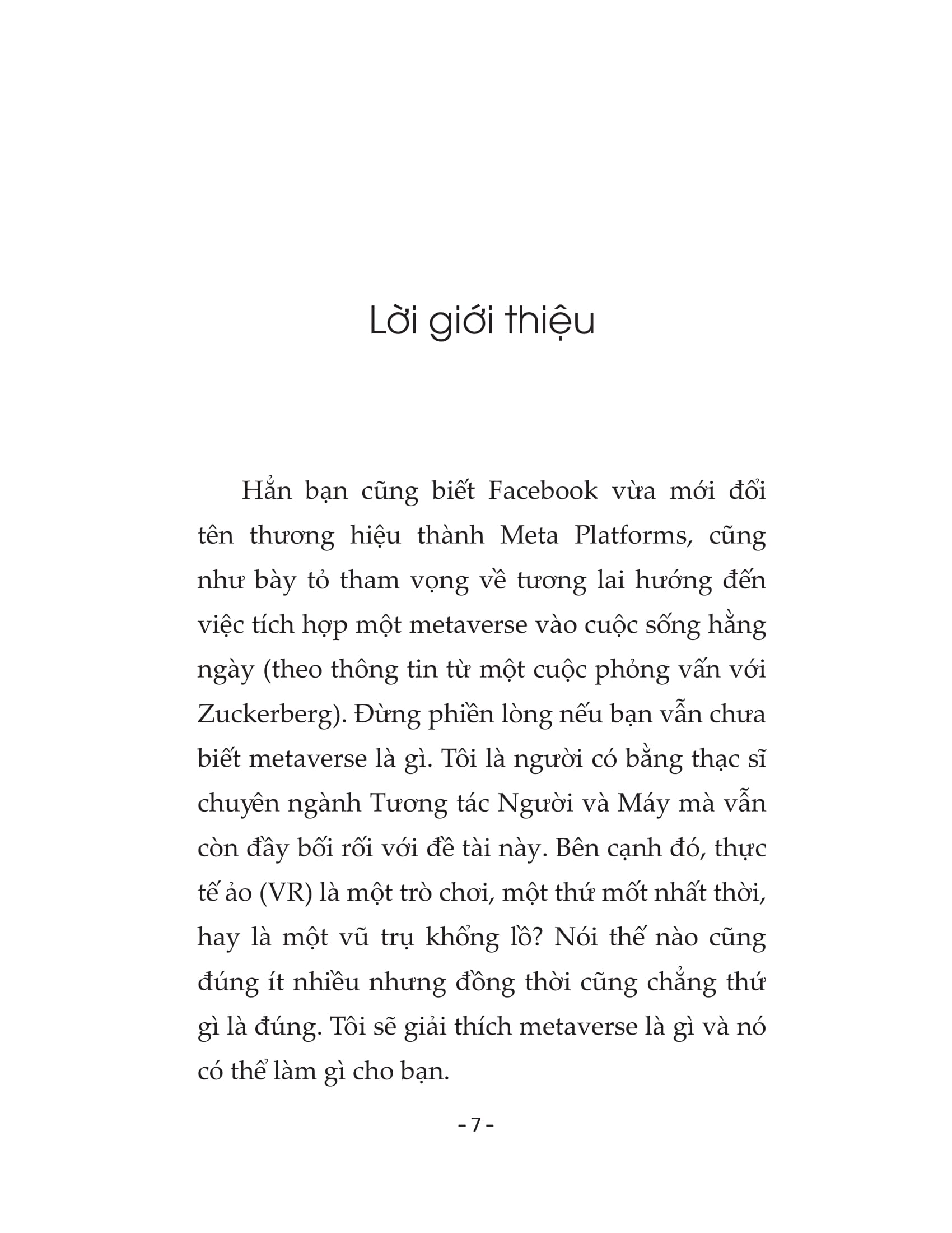 Khái niệm metaverse xuất hiện lần đầu tiên trong tiểu thuyết khoa học viễn tưởng, mô tả một xã hội trong đó các cá nhân say mê những avatar ảo, các công ty máy tính đa quốc gia nắm giữ quyền lực lớn hơn cả chính phủ và cuộc sống vật chất thì liên tục xuống cấp. Liệu chúng ta có thể duy trì thái độ bàng quan, “chuyện gì đến sẽ đến” đối với tương lai của mình nữa không, khi khoa học ngày nay đã bắt kịp với những tình tiết tưởng như chỉ có trong tiểu thuyết khoa học viễn tưởng? Cuốn sách METAVERSE đưa ra bức tranh toàn cảnh để nhấn mạnh rằng, con người không thể chỉ thụ động chờ đợi, mà cần nêu lên nhiều câu hỏi, tư duy đa góc độ và đưa ra các quyết định một cách cẩn thận, có đạo đức - nhất là khi chúng ta đang tự tay xây dựng tương lai của mình bằng cách sử dụng khoa học và công nghệ.