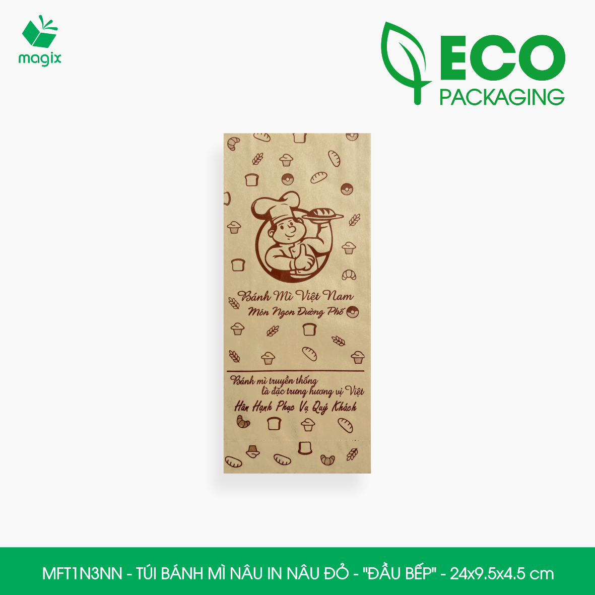 ĐẶC ĐIỂM SẢN PHẨM Chất liệu: Túi bánh mì in thường được làm từ giấy kraft nhật định lượng 50gsm thấm dầu có giấy chứng nhận FDA đảm bảo vệ sinh an toàn thực phầm Thiết kế: Miệng túi thiết kế chia thành 2 lớp dễ dàng thao tác bỏ bánh mì vào túi, đơn giản và tiện dụng    CÔNG DỤNG Tiện lợi: Bảo vệ bánh mì khỏi bụi bẩn, môi trường ô nhiễm, tác động từ bên ngoài và tránh làm dơ tay khi sử dụng Quảng cáo thương hiệu: Túi bánh mì in được sử dụng như một phương tiện quảng cáo nhỏ gọn và hiệu quả, với thiết kế in ấn logo, thông tin về sản phẩm và các thông điệp quảng cáo khác Bảo vệ môi trường: Túi bánh mì được làm từ chất liệu giấy kraft nguyên sinh, giúp giảm thiểu lượng rác thải nhựa và bảo vệ môi trường Tiết kiệm chi phí: Túi giấy bánh mì có giá thành thấp hơn so với các loại bao bì khác như hộp giấy, hộp nhựa đựng bánh mì   TIÊU CHUẨN KỸ THUẬT Chất liệu: Giấy Kraft chuyên dùng cho thực phẩm đạt tiêu chuẩn FDA  Định lượng: 50gsm Mã hàng - Kiểu in - Kích thước  • MFT1N5NN - Túi bánh mì nâu in nâu - "Giỏ bánh mì" - 24x9.5x4.5 cm  • MFT1T5N - Túi bánh mì trắng in nâu - "Giỏ bánh mì" - 24x9.5x4.5 cm  • MFT1N4X - Túi bánh mì nâu in xanh lá - "Best street food" - 24x9.5x4.5 cm  • MFT1T4X - Túi bánh mì trắng in xanh lá - "Best street food" - 24x9.5x4.5 cm  • MFT1N4NN - Túi bánh mì nâu in nâu đỏ - "Best street food" - 24x9.5x4.5 cm  • MFT1T4N - Túi bánh mì trắng in nâu - "Best street food" - 24x9.5x4.5 cm  • MFT1T3C - Túi bánh mì trắng in cam - "Đầu bếp" - 24x9.5x4.5 cm  • MFT1N3NN - Túi bánh mì nâu in nâu đỏ - "Đầu bếp" - 24x9.5x4.5 cm  • MFT1T3NN - Túi bánh mì trắng in nâu đỏ - "Đầu bếp" - 24x9.5x4.5 cm  • MFT1N2NN - Túi bánh mì nâu in nâu đỏ - "Cối xay gió" - 24x9.5x4.5 cm  • MFT1T2N - Túi bánh mì trắng in nâu - "Cối xay gió" - 24x9.5x4.5 cm  • MFT1N1NN - Túi bánh mì nâu in nâu đỏ - "Xe bánh mì" - 24x9.5x4.5 cm  • MFT1T1N - Túi bánh mì trắng in nâu - "Xe bánh mì" - 24x9.5x4.5 cm   LƯU Ý Bảo quản sản phẩm nơi khô ráo, sạch sẽ tránh tiếp xúc trực tiếp với ánh nắng mặt trời và nhiệt độ cao.
