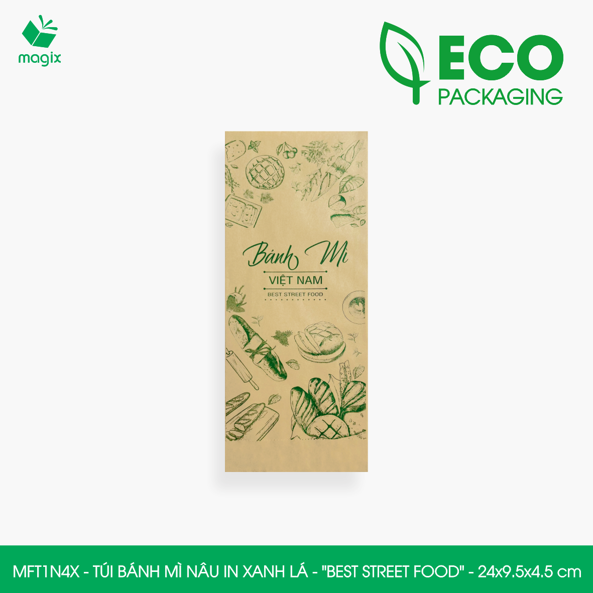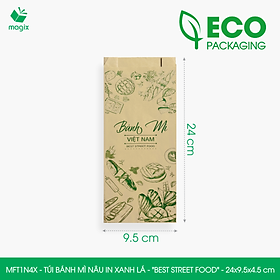• MFT1N4X - Túi bánh mì nâu in xanh lá - "Best street food" - 24x9.5x4.5 cm