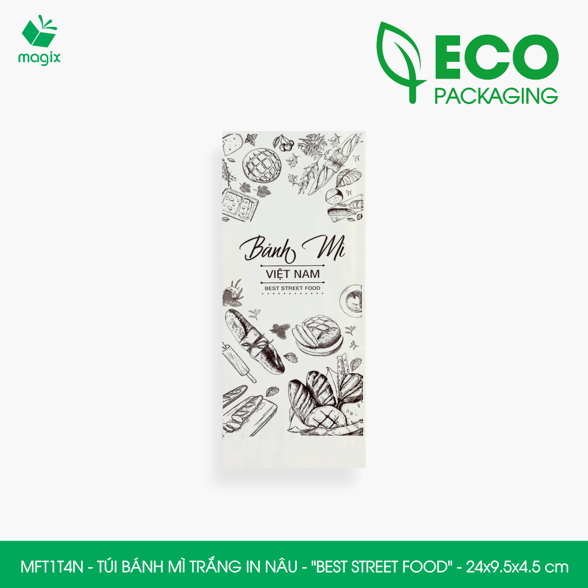 ✨MFT1T4N - 24x9.5x4.5 cm - 100 Túi bánh mì Trắng, in sẵn họa tiết BEST STREET FOOD - Bao bánh mì Túi giấy thực phẩm an toàn