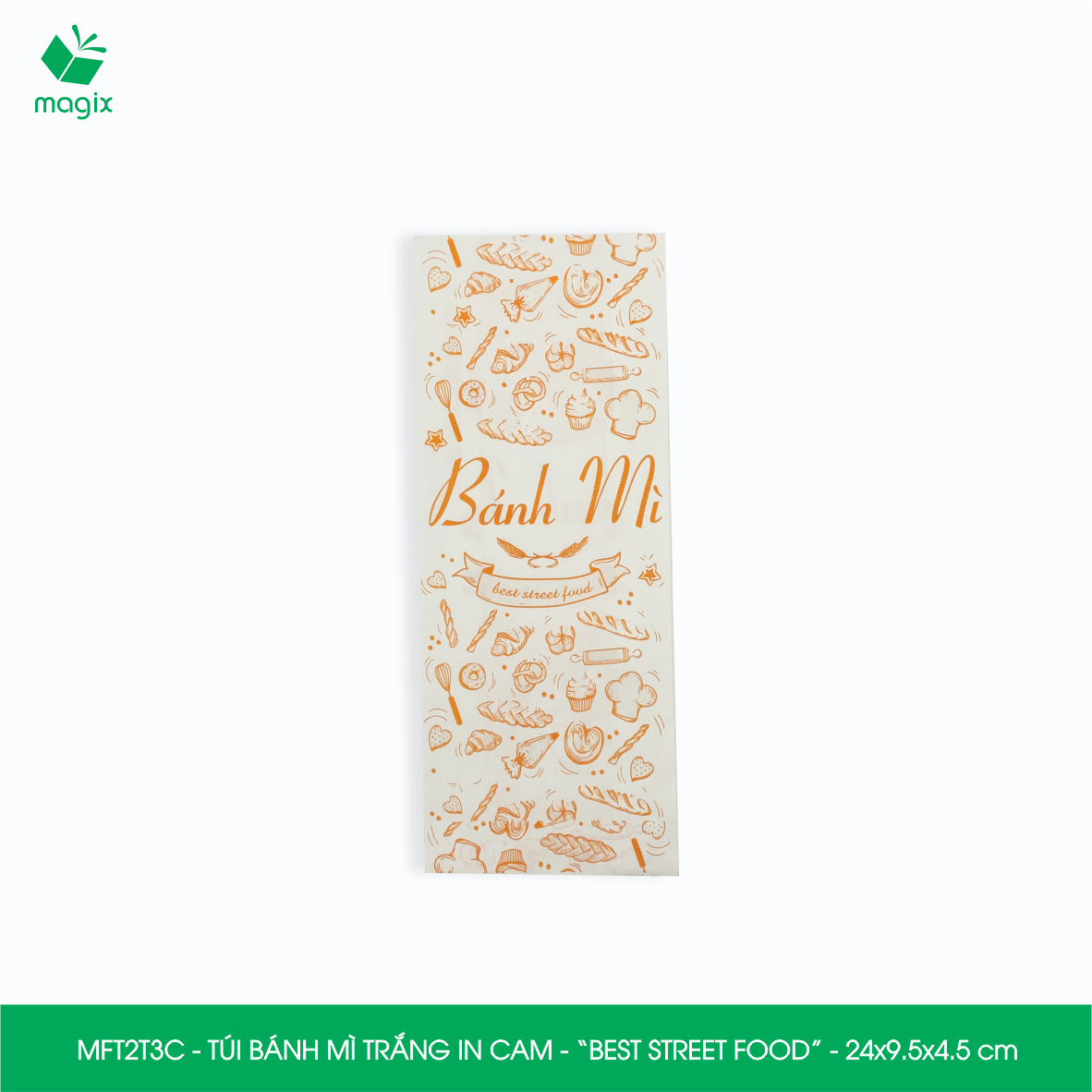 Túi đựng bánh mì truyền thống Việt Nam với thiết kế xếp hông, túi dán 3 biên có kích thước 24x9.5x4.5 cm. Chất lượng giấy đảm bảo vệ sinh an toàn thực phẩm, được nhiều cửa hàng, chuỗi bánh mì tin dùng sử dụng.    ƯU ĐIỂM Tiện lợi, đảm bảo vệ sinh an toàn thực phẩm: Thiết kế dạng túi mở vừa vặn ổ bánh mì. Sử dụng chất liệu giấy thấm dầu chuyên dành cho ngành công nghiệp thực phẩm giúp bảo vệ bánh mì khỏi ẩm mốc và giữ bánh tươi ngon lâu hơn. Tăng tính thẩm mỹ, chuyên nghiệp: Túi bánh mì in được sử dụng như một phương tiện quảng cáo nhỏ gọn và hiệu quả với thiết kế in ấn họa tiết đẹp mắt Thân thiện môi trường: Được làm từ giấy thực phẩm chất lượng cao, giúp giảm thiểu lượng rác thải nhựa và bảo vệ môi trường.   QUY CÁCH KỸ THUẬT  Kích thước: Xếp hông: 4.5 cm/ Cao: 24 cm/ Ngang: 9.5 cm Chất liệu: Giấy MG40 chuyên dùng cho thực phẩm đạt tiêu chuẩn FDA Mỹ Định lượng: 40gsm Mã sản phẩm - Kiểu in:  • MFT2T1C - Túi bánh mì trắng in cam - "Chả cá"   • MFT2T2C - Túi bánh mì trắng in cam - "Món ngon đường phố"  • MFT2T3C - Túi bánh mì trắng in cam - "Best street food"  • MFT2V4N - Túi bánh mì vàng in nâu - "Bông lúa"  • MFT2V5X - Túi bánh mì vàng in xanh - "Best street food"  • MFT2T6VD - Túi bánh mì trắng in vàng đỏ - "Premium quality"   • MFT2N7DD - Túi bánh mì nâu in đỏ đen - "Cô gái"   LƯU Ý Bảo quản sản phẩm nơi khô ráo, sạch sẽ tránh tiếp xúc trực tiếp với ánh nắng mặt trời và nhiệt độ cao.