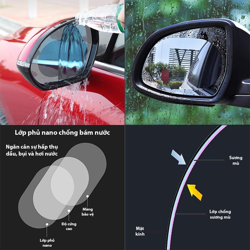 – Với miếng dán gương kính chống nước có thể dùng cho mọi loại xe ô tô hoặc xe máy.– Hiệu quả chống nước hoàn hảo, giúp bạn quan sát gương dưới trời mưa, đảm bảo tầm nhìn của người lái xe luôn rõ nét dưới mưa và ban đêm cả khi di chuyển ở tốc độ cao giúp bạn lái xe an toàn tuyệt đối.– Giúp chống bám nước kính chiếu hậu tuyệt đối, tăng cường độ sáng cho gương– Giúp chống nước giúp gương không bị làm mờ khi gặp trời mưa, tài xế dễ quan sát tránh được những rủi ro không đáng có xảy ra.– Giúp giảm thiểu ánh sáng chói lóa từ các phương tiện tham gia giao thông khác từ phía sau, tài xế tăng khả năng quan sát tốt hơn.