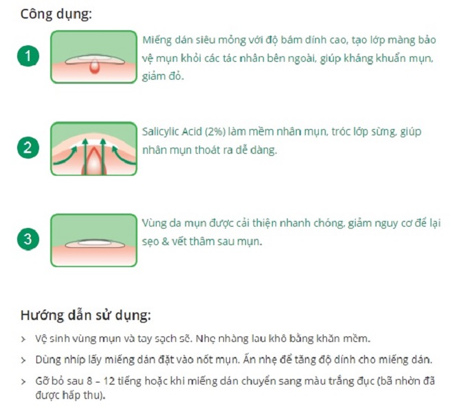 Thành phần Acrylates Copolymer, Alcohol, Vinyl Caprolactam/VP/dimethylaminoethyl Methacrylate Copolymer, Salicylic Acid, Water… Công dụng: Miếng dán giúp che phủ khỏi các tác nhân bên ngoài, giúp sạch mụn, kháng mụn, giảm đỏ. Hướng dẫn