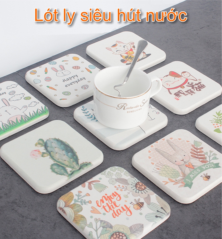 Mua tại TiktokMiếng lót ly - Tấm lót ly, cốc siêu hút nước bằng đất xốp Diatomite họa tiết, thông điệp dễ thương