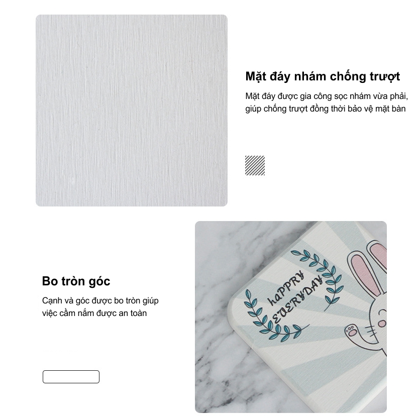 Tấm lót ly được làm từ vật liệu Diatomite với cấu tạo là các hạt xốp, 90% thể tích là lỗ rỗng nên khối lượng tuy nhẹ nhưng hút nước cực tốt. Với nhiều họa tiết hoạt hình và thông điệp dễ thương, sản phẩm phù hợp để sử dụng tại nhà, văn phòng hay làm quà tặng cho bạn bè, người thân,... Mỗi sản phẩm được đóng gói hộp giấy xinh xắn.