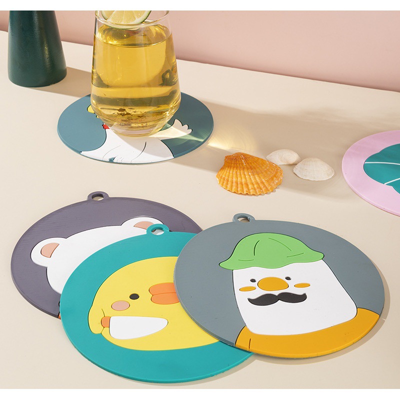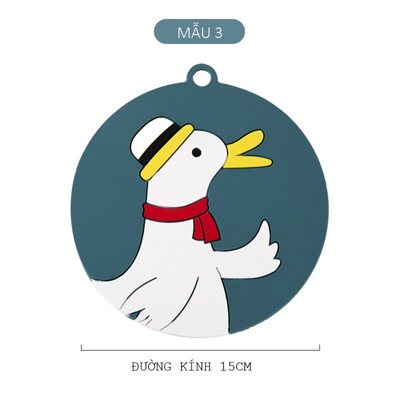 Chất liệu: PVC Phân loại: gồm 4 mẫu (Gấu trắng, Ông già, Vịt trắng, Gà vàng) Kích thước: Đường kính miếng lót 15cm Công dụng: để lót nồi, ly, chén, tô, Chất liệu mềm dẻo,