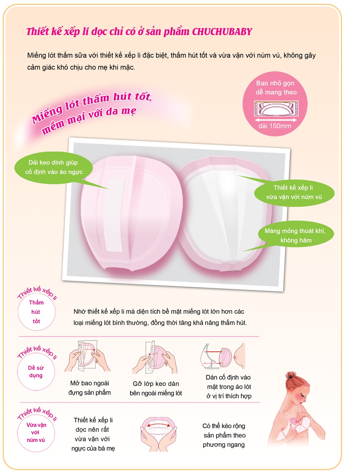 - Thiết kế xếp li độc đáo với 4 điểm nếp gấp 2 bên tạo nên cấu trúc W 3 chiều, giúp dễ dàng điều chỉnh ôm khít vòng ngực của mẹ, tăng diện tích tiếp xúc cũng như khả năng thấm hút đồng thời làm tăng tính thẩm mỹ.