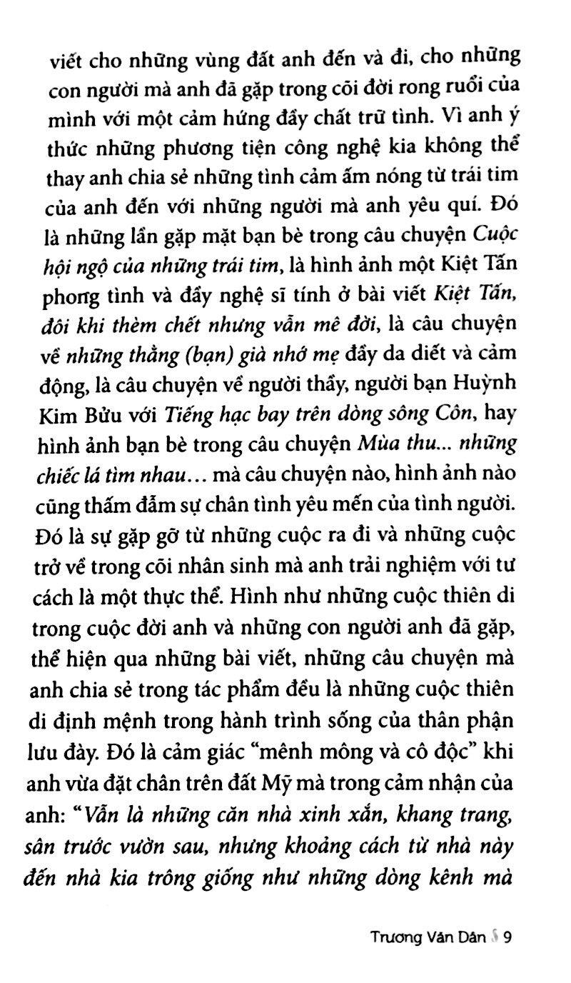 Có thể nói những cuộc viễn du của Trương Văn Dân khắp năm châu, bốn biển cũng là một phương thức để tích lũy vốn sống cho những trang viết. Chính vì vậy ở những câu chuyện của Trương Văn Dân, cuộc sống bày ra ngồn ngộn, thậm chí khá bộn bề.(…) Một phương diện khác của cõi nhân sinh trong Milano Sài Gòn, đang về hay sang? đó là nỗi ám ảnh về nguồn cội, về đất nước quê hương mà dẫu có sống ở những quốc gia giàu sang đến mức nào thì khát vọng tìm về cội nguồn vẫn luôn canh cánh trong lòng những con dân nước Việt. Và đây là những trang văn hay và cảm động trong tập truyện mà Trương Văn Dân muốn chia sẻ với người đọc với tư cách là một chứng nhân, là người trong cuộc. …, Hy vọng, đọc tác phẩm này các bạn sẽ chia sẻ với những vấn đề tác giả nói đến trong cõi nhân sinh và tìm được cho mình “một cõi đi về”. Đó là cõi đi về phía ánh sáng của tình yêu thương, lòng nhân ái và sự hướng thiện, vốn là những giá trị hằng cửu mà những tác phẩm văn học đích thực mang đến cho con người. Milano Sài Gòn, đang về hay sang? của Trương Văn Dân là một tác phẩm văn chương như thế mà tôi muốn chia sẻ như một người đọc tri âm .