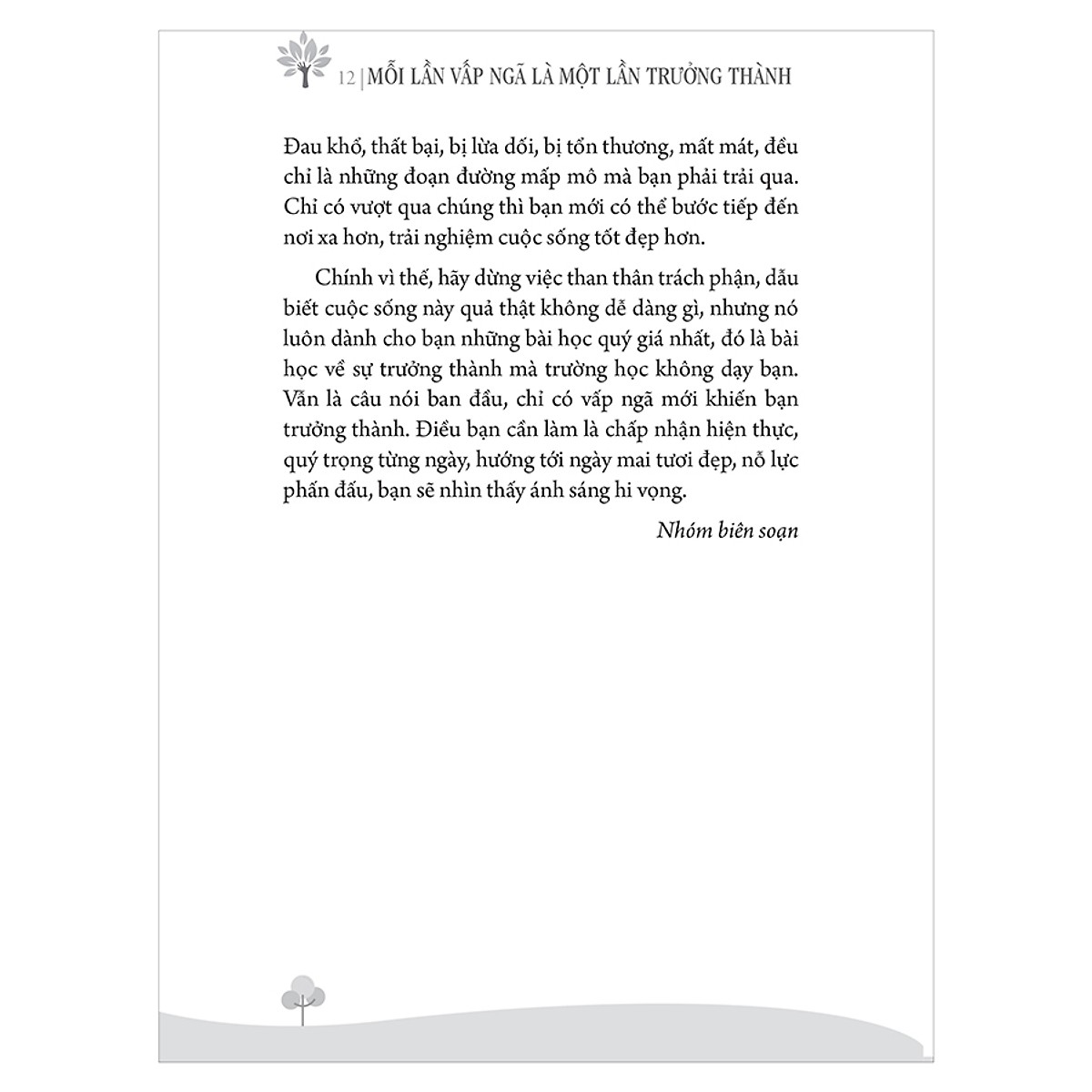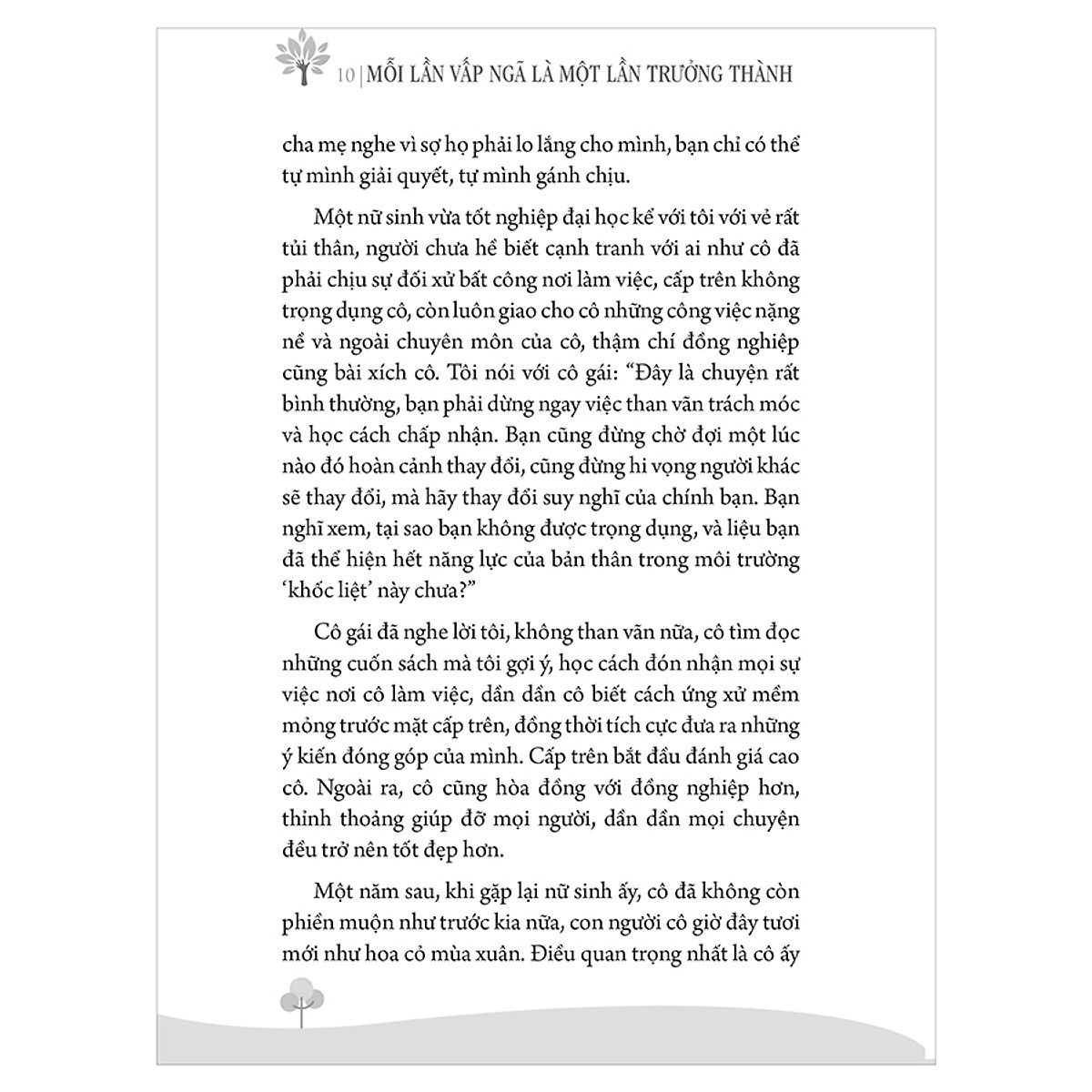 Nhưng mong bạn suy nghĩ kĩ, mỗi khi bạn gặp phải khó khăn hoặc vấp ngã, ngoài việc cảm thấy đau khổ về mặt tinh thần, bạn còn học được điều gì? Tôi dám khẳng định rằng bạn đã có được kinh nghiệm, và khi đã lĩnh hội, bạn sẽ không vấp ngã lại nơi bạn đã từng ngã. Đây chính là sự trưởng thành.