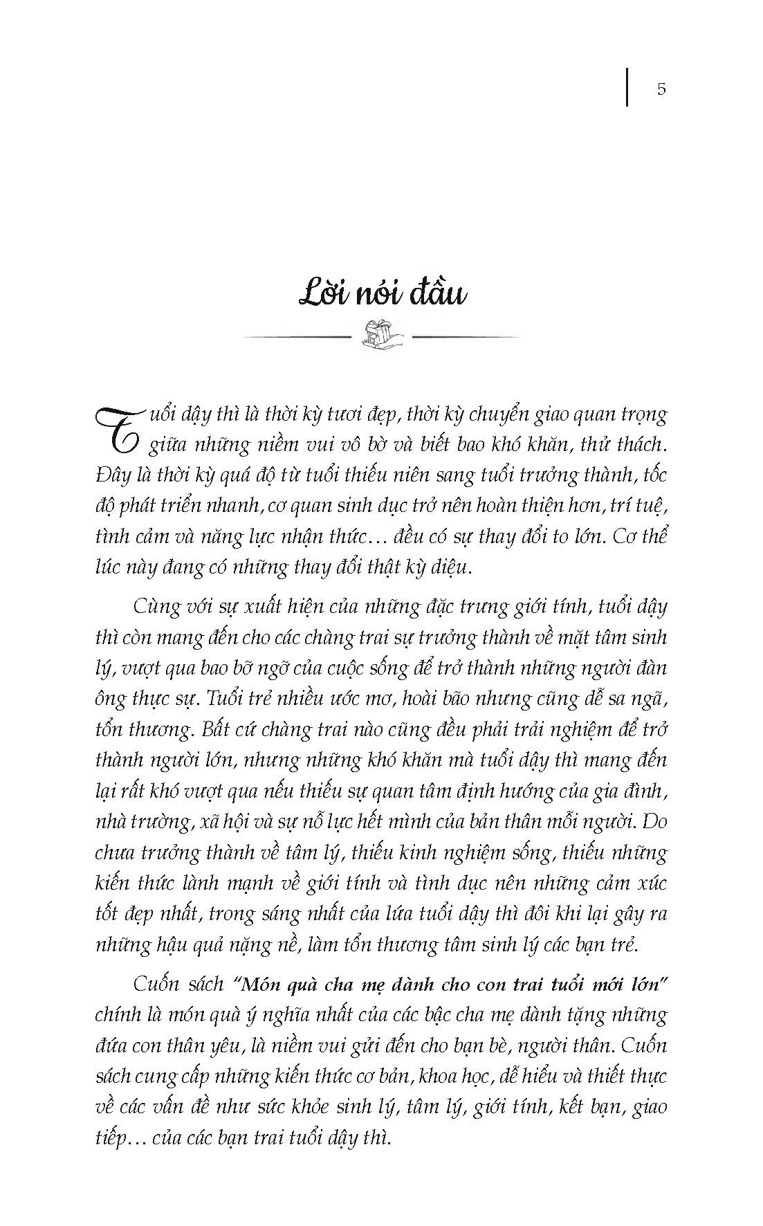 Mua tại Tiktok"Món quà cha mẹ dành cho con trai tuổi mới lớn" là cuốn sách không thể thiếu cho hành trình trưởng thành của các bạn trai. Cuốn sách cung cấp những kiến thức khoa học, dễ hiểu và thiết thực về các vấn đề mà các bạn trai thường gặp phải như: sức khỏe sinh lý, tâm lý, giới tính, kết bạn, giao tiếp… của các bạn trai tuổi dậy thì; giúp các cậu trai trẻ vượt qua những biến đổi tâm lý và sinh lí trong thời kỳ dậy thì.