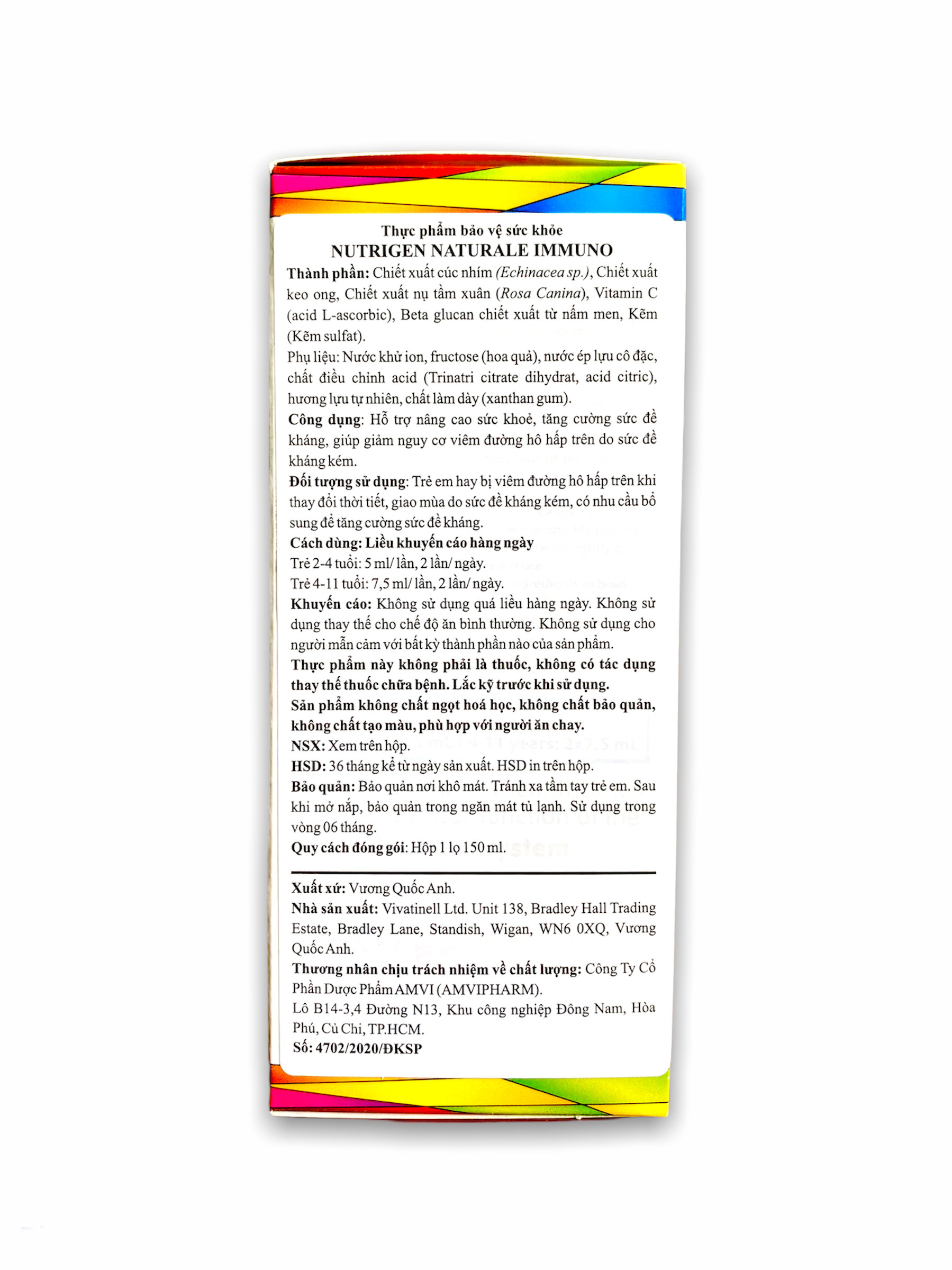 - Giảm số ngày bị sốt Thành phần Chiết xuất cúc nhím (Echinacea sp.), Chiết xuất keo ong, Chiết xuất nụ tầm xuân (Rosa Canina), Vitamin C (acid L-ascorbic), Beta glucan chiết xuất từ nấm men, Kẽm (Kẽm sulfat). Phụ liệu: Nước khử ion, fructose (hoa quả), nước ép lựu cô đặc, chất điều chỉnh acid (Trinatri citrate dihydrat, acid citric), hương lựu tự nhiên, chất làm dày (xanthan gum). Công dụng Hỗ trợ nâng cao sức khỏe, hỗ trợ tăng cường sức đề kháng, hỗ trợ giảm nguy cơ viêm đường hô hấp trên do sức đề kháng kém. Đối tượng sử dụng Trẻ em hay bị viêm đường hô hấp trên khi thay đổi thời tiết, giao mùa do sức đề kháng kém, có nhu cầu bổ sung để tăng cường sức đề kháng. Hướng dẫn sử dụng Khuyến cáo hàng ngày: Trẻ 2-4 tuổi: 5ml/lần, 2 lần/ngày Trẻ 4-11 tuổi: 7,5ml, 2 lần/ngày Khuyến cáo Không sử dụng quá liều hàng ngày. Không sử dụng thay thế cho chế độ ăn bình thường. Không sử dụng cho người mẫn cảm với bất kì thành phần nào của sản phẩm. Thực phẩm này không phải là thuốc và không có tác dụng thay thế thuốc chữa bệnh. Lắc kỹ trước khi dùng. NSX: Xem trên hộp. HSD: 36 tháng kể từ ngày sản xuất. HSD in trên hộp. Bảo quản: Nơi khô mát, tránh xa tầm tay trẻ em. Sau khi mở nắp, bảo quản trong ngăn mát tủ lạnh. Sử dụng trong vòng 06 tháng. Quy cách đóng gói: Hộp 1 lọ 150ml Xuất xứ: Vương Quốc Anh Nhà sản xuất: Vivatinell Ltd. Unit 138, Bradley Hall Trading Estate, Bradley Lane, Standish, Wigan, WN6 0XQ, Vương Quốc Anh Thương nhân chịu trách nhiệm về chất lượng: Công ty Cổ phần Dược phẩm AMVI (Amvipharm) Lô B14-3,4 đường N13, khu công nghiệp Đông Nam, Hòa Phú, Củ Chi, TP.HCM Số ĐKSP: 4702/2020/ĐKSP Số XNQC: 2347/2020/XNQC-ATTP