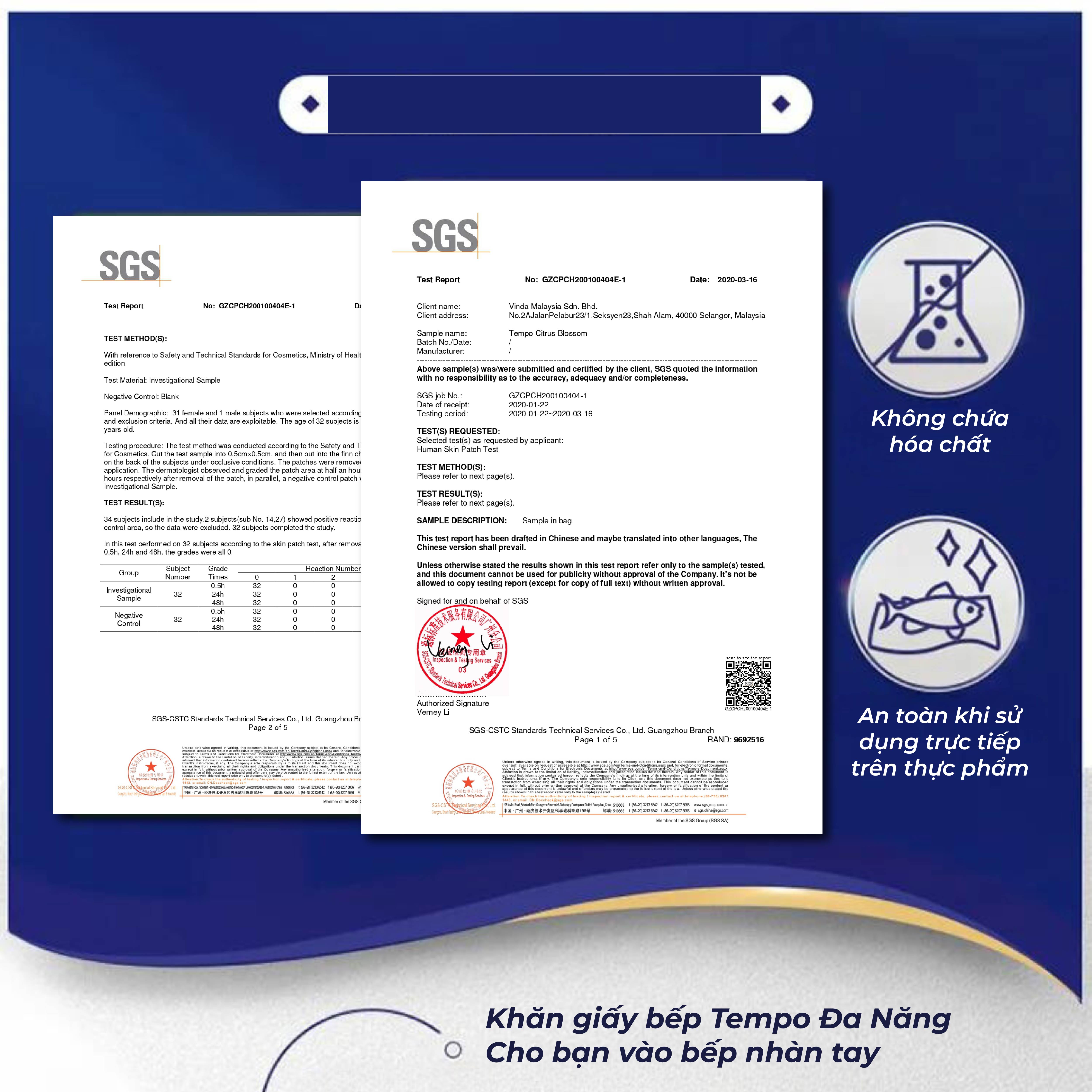** TEMPO là thương hiệu khăn giấy cao cấp của Đức từ năm 1929. Với chất lượng và công nghệ vượt trội, Tempo đang chiếm lĩnh vị trí số 1 tại thị trường Đức, Ý, Thụy Sỹ... Tempo là thương hiệu khăn giấy được yêu thích và tin dùng tại nhiều quốc gia trên thế giới, đặc biệt là Châu Âu và Châu Á. Được sản xuất theo công thức cải tiến mới và nguyên liệu tự nhiên đạt chuẩn Châu Âu, khăn giấy bếp đa năng siêu thấm Tempo đa năng, chất lượng giấy dày và bền dai hơn giúp thấm hút dầu thừa, nước vượt trội, tiện lợi. *ĐẶC ĐIỂM NỔI BẬT: + Công nghệ Fabric Air thấm hút vượt trội, bền dai + Khăn giấy 3 lớp + Bền dai khi ướt + Đạt 5 giấy chứng nhận VSATTP: FDA, ISO, LFGB, EDQM, GB + Tiện lợi, vệ sinh, dễ rút + Hoa văn dập nổi tinh tế trên từng lớp giấy + 100% bột gỗ giấy nguyên sinh, không bụi giấy Khăn giấy bếp đa năng siêu thấm dạng gói với 3 lớp giấy cao cấp, không chứa chất độc hại, đặc biệt an toàn cho thực phẩm, mang đến bạn cảm giác thực sự yên tâm khi sử dụng. Với thiết kế dạng gói rút tiện lợi, khăn giấy bếp đa năng siêu thấm Tempo đa năng dễ dàng và phù hợp sử dụng cho các sinh hoạt hằng ngày. *THÀNH PHẦN NGUYÊN LIỆU: Được làm 100% từ bột gỗ giấy nguyên sinh. *Hướng dẫn sử dụng: Khăn giấy bếp đa năng siêu thấm dùng vệ sinh trong khu bếp và các sinh hoạt hằng ngày. *Hướng dẫn bảo quản: Để nơi thoáng mát và tránh ánh nắng mặt trời. *Cảnh báo an toàn sức khỏe: Không được ăn và tránh xa tầm tay trẻ em. *Quy cách đóng gói: Số lượng: 3 gói/ lốc, 60 tờ/ gói. Số lớp: 3 lớp/ tờ. Định lượng của 1 lớp giấy: 18,0 ± 1,0g/m2. Kích thước: (224 mm x 193 mm) ± 3%. *Ngày sản xuất: in trên gói theo năm/tháng/ngày. *Hạn sử dụng: 3 năm kể từ ngày sản xuất *Sản phẩm an toàn với các tiêu chuẩn: + FDA: Tuân thủ theo tiêu chuẩn Quản lý Thực phẩm và Dược phẩm Hoa Kỳ + ISO: Nhà máy tuân thủ hệ thống quản lý an toàn thực phẩm ISO 22000 + Không sử dụng chất làm trắng huỳnh quang Tempo Softpack - Sản phẩm chính hãng của Tempo - Thương hiệu đến từ Đức