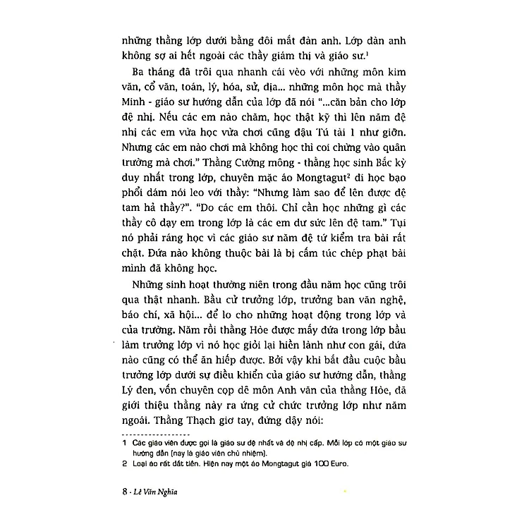 - "Những sinh hoạt thường niên trong đầu năm học cũng trôi qua thật nhanh. Bầu cử trưởng lớp, trưởng ban văn nghệ, báo chí, xã hội... để lo cho những hoạt động trong lớp và của trường. Năm rồi thẳng Hỏe được mấy đứa trong lớp bầu làm trưởng lớp vì nó học giỏi lại hiền lành như con gái, đứa nào cũng có thể ăn hiếp được. Bởi vậy khi bắt đầu cuộc bầu trưởng lớp dưới sự điều khiển của giáo sư hướng dẫn, thẳng Lý đen, vốn chuyên cọp dễ môn Anh văn của thằng Hỏe, đã giới thiệu thằng này ra ứng cử chức trưởng lớp như năm ngoài. Thằng Thạch giơ tay, đứng dậy nói: ..."